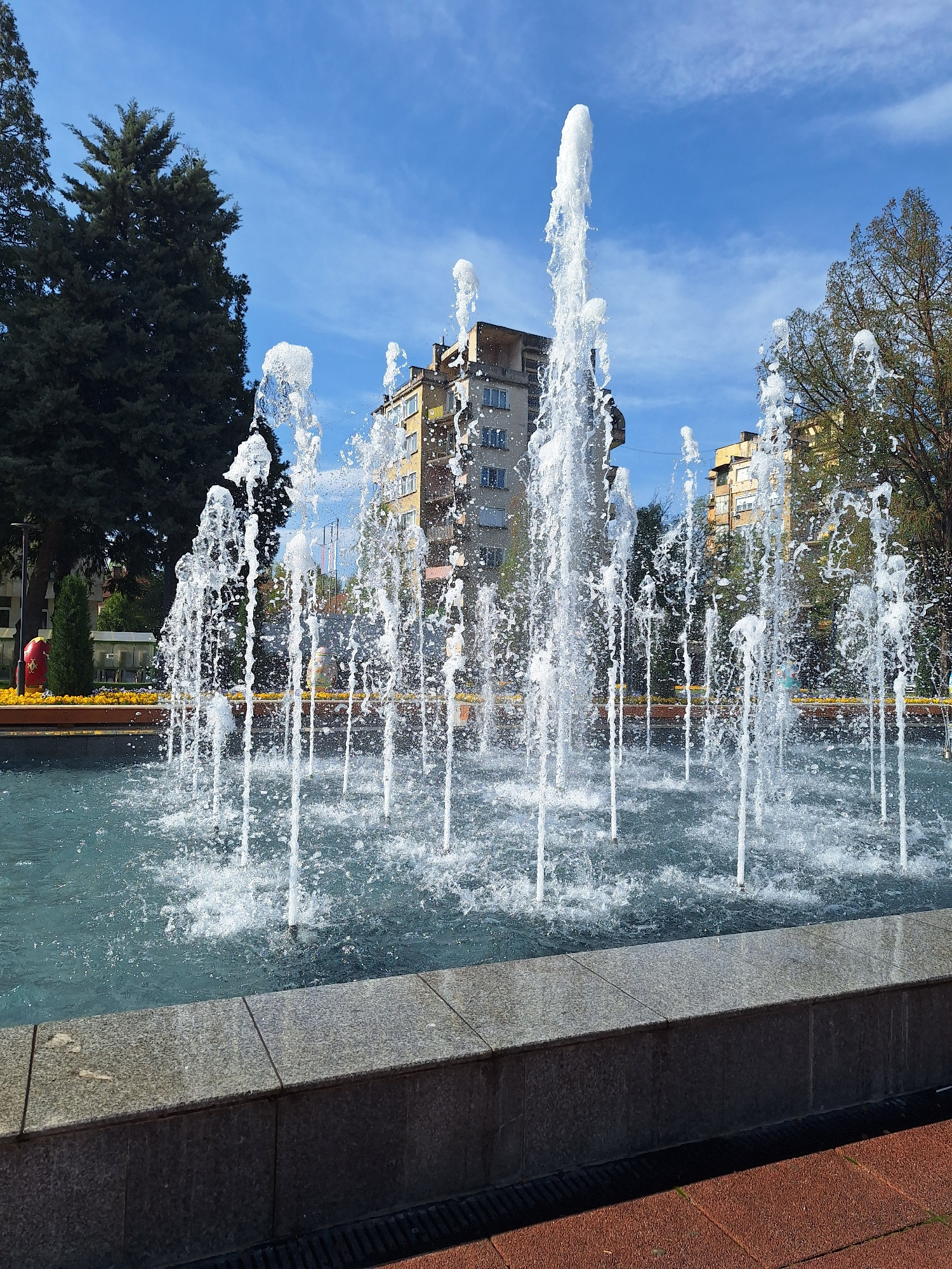 The image captures a vibrant outdoor scene, likely a public square or park in Montana, Bulgaria, under a clear, bright blue sky with wispy clouds. A dynamic water fountain is prominent, with numerous…read more