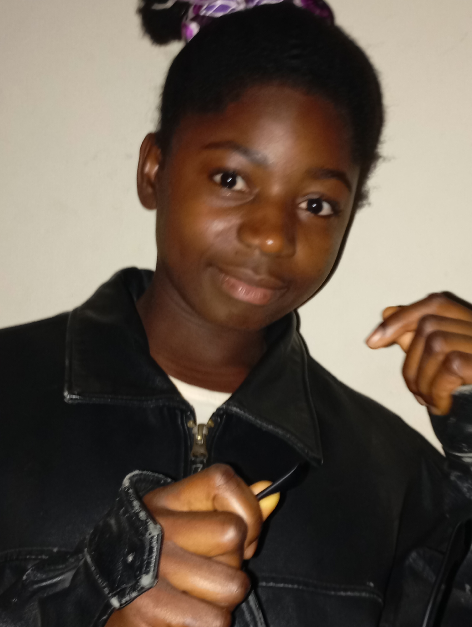 A young, dark-skinned woman with her hair pulled back, possibly in a bun, is posing for a photo in what appears to be an indoor setting. She is wearing a black leather jacket over a white top, partial…read more