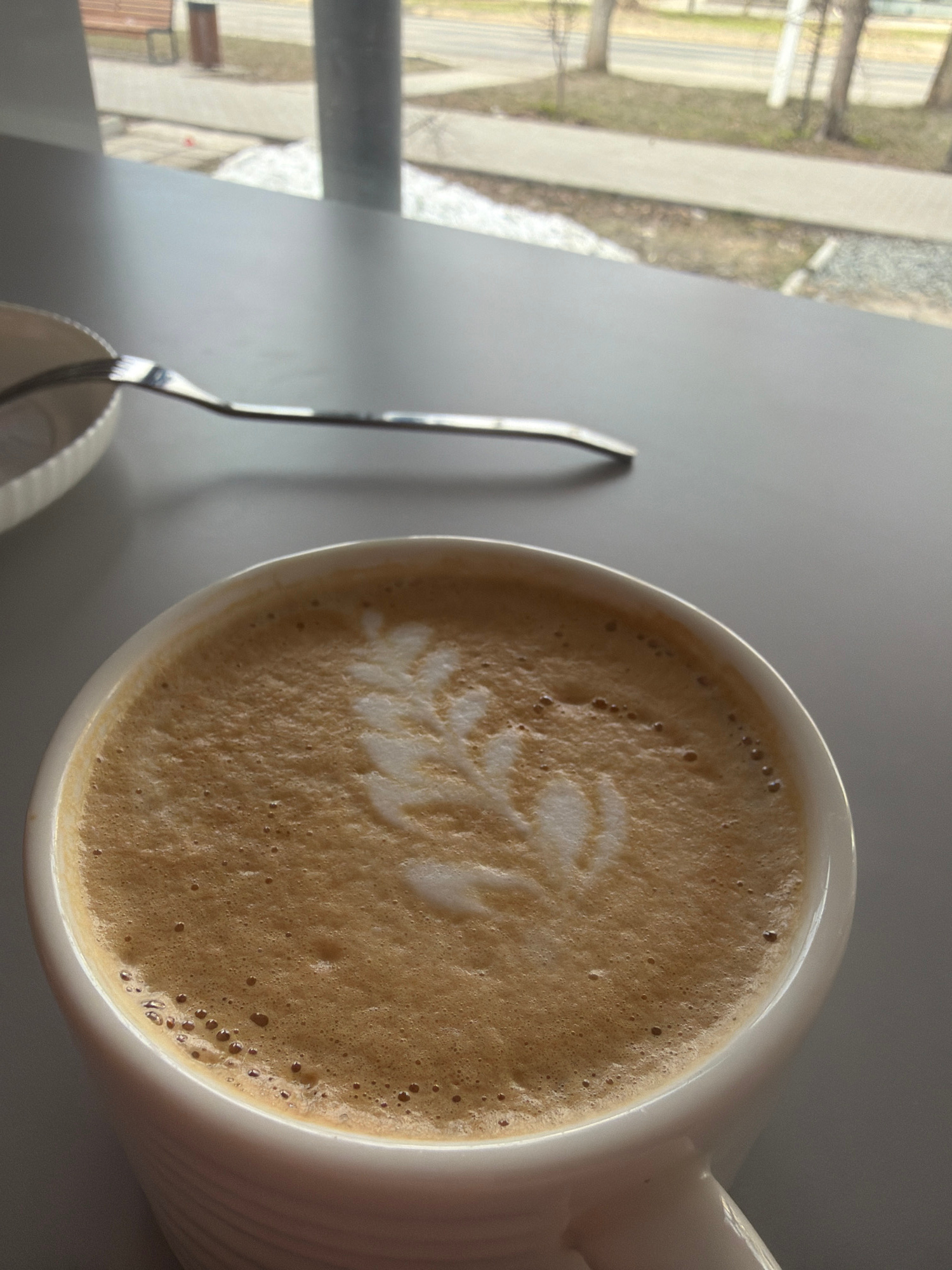 An overhead photograph captures a white ceramic mug filled with coffee, likely a latte or cappuccino, resting on a smooth, grey table or countertop. The coffee features intricate latte art, resemblingβ¦read more