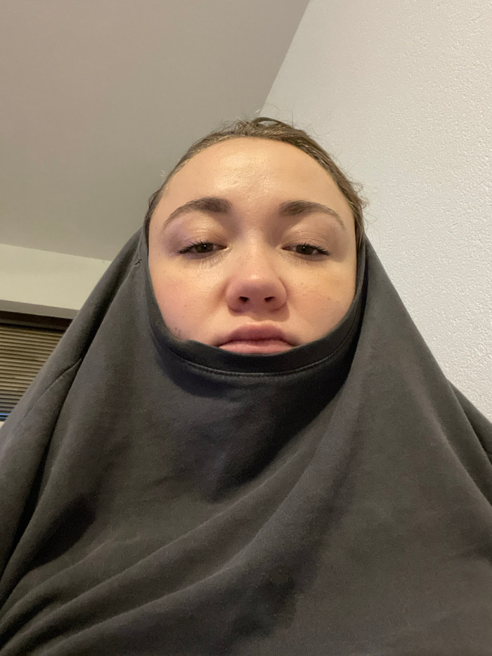 A pale-skinned woman's face, framed by a grey t-shirt pulled over her head, dominates the frame. Her eyes are slightly closed, with visible eyelashes and eyebrows. Her nose and lips are centrally posi…read more