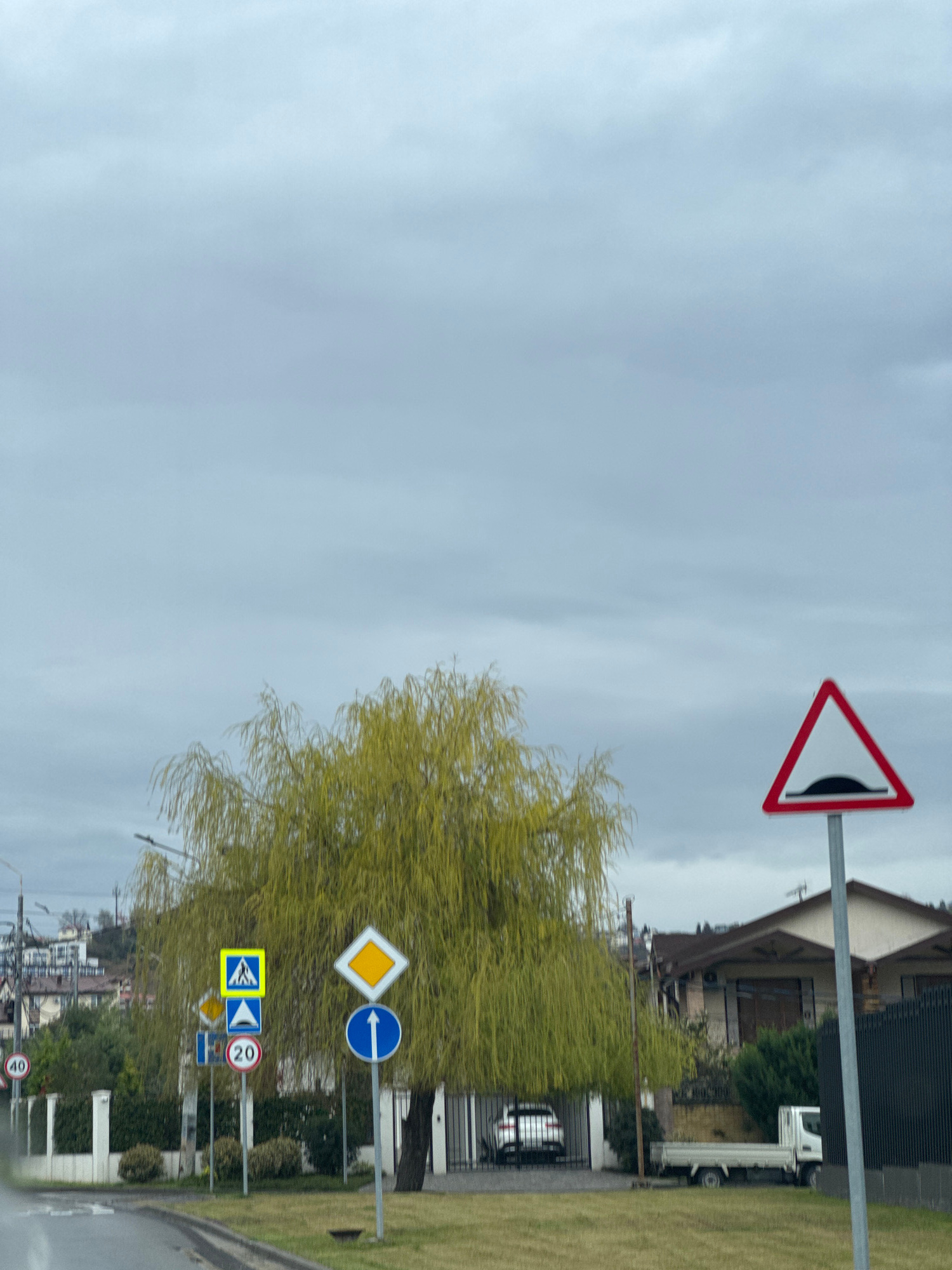 The image depicts a street scene in Sirius, Russia under an overcast sky. A variety of road signs are visible along the right side of the street, including a pedestrian crossing sign, a yield sign, a…read more