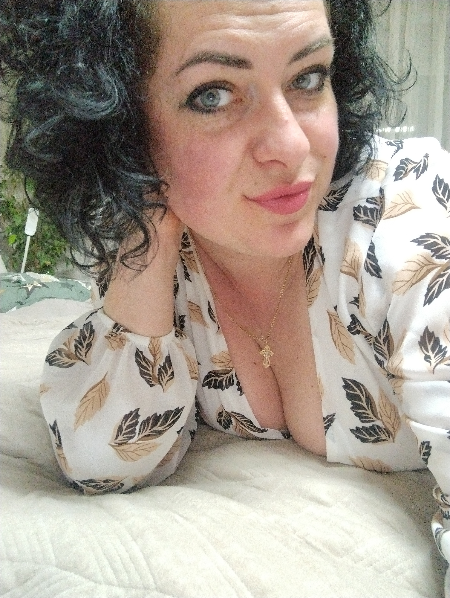 A woman with curly black hair and blue eyes is lying on a bed. She is wearing a white, long-sleeved shirt with a leaf pattern and a gold necklace with a cross pendant. Her left hand is resting on her…read more