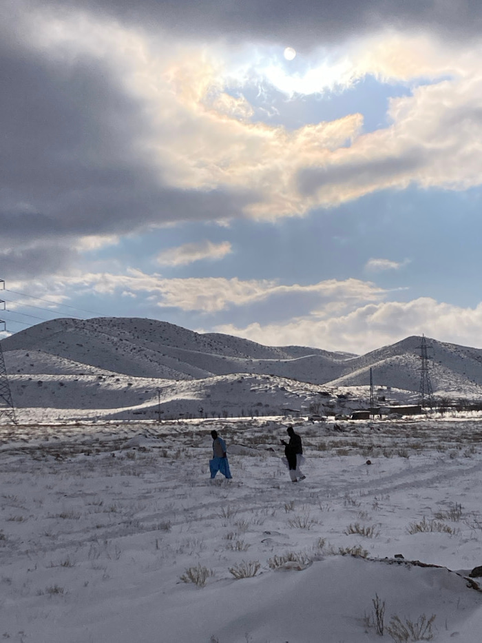 The image depicts a snow-covered landscape in Churmian, Pakistan, under a partially cloudy sky with sunlight breaking through a circular opening in the clouds in the upper-right quadrant. The foreground consists of a vast, flat expanse of snow with sparse, dry vegetation protruding, and faint tracks are visible on its surface. Two individuals are walking from left to right across this snow-covered field. The person on the left wears light blue, loose-fitting trousers and a dark upper garment. The person on the right is dressed in dark clothing and appears to be holding a dark, rectangular object, possibly a mobile phone, near their chest. In the mid-ground and background, undulating hills are extensively covered in snow, with some darker patches of exposed ground or vegetation. Tall lattice transmission towers are present on both the far left and far right sides of the image, extending into the mid-ground. A small cluster of buildings or structures is visible in the distant mid-ground, positioned at the base of the snow-covered hills on the right side. | Open Wire