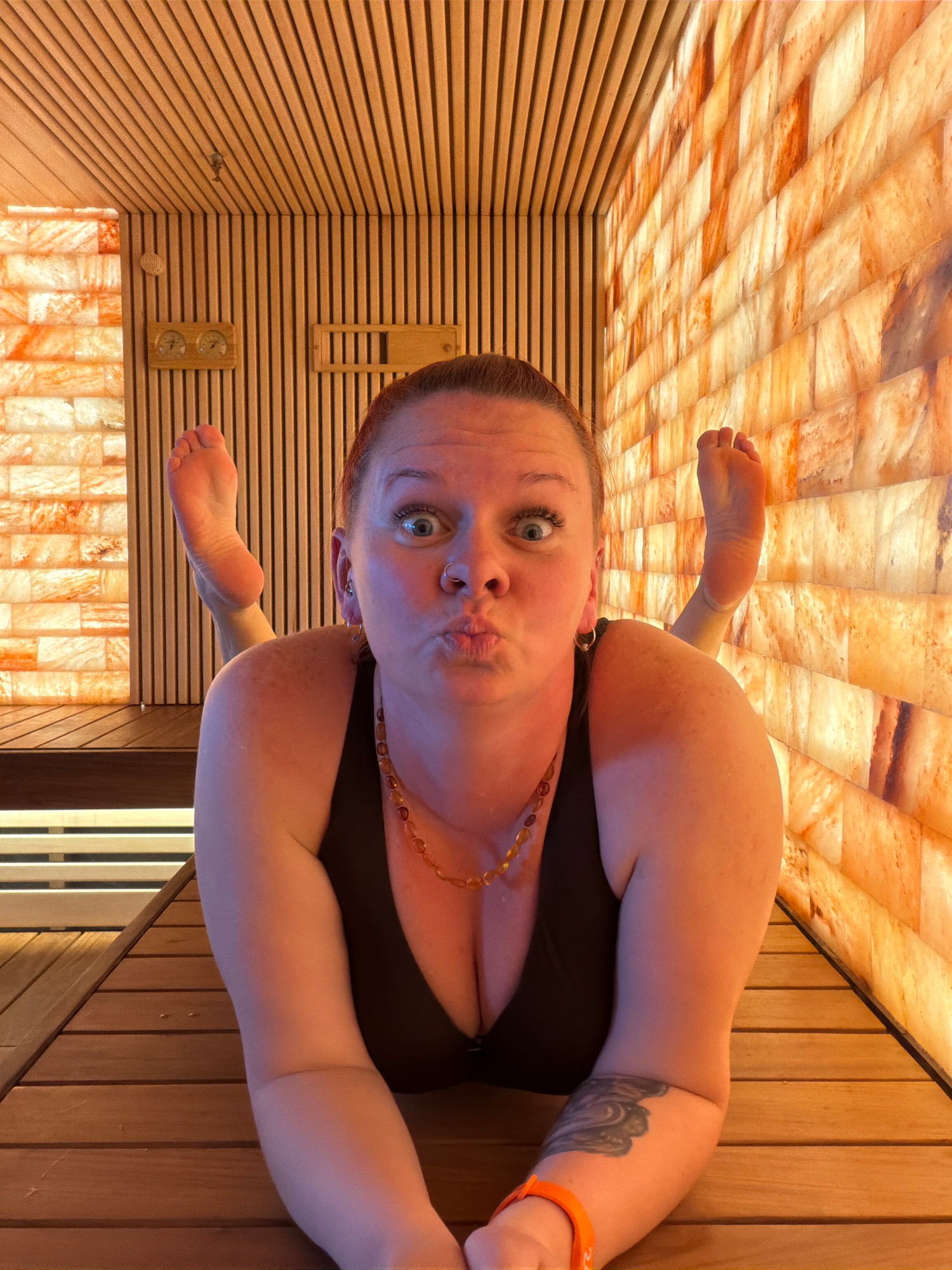 The image shows a woman lying down in what appears to be a sauna or salt room, evidenced by the wooden slats and illuminated salt panels. She is wearing a dark-colored top and a necklace. Her face isβ¦read more