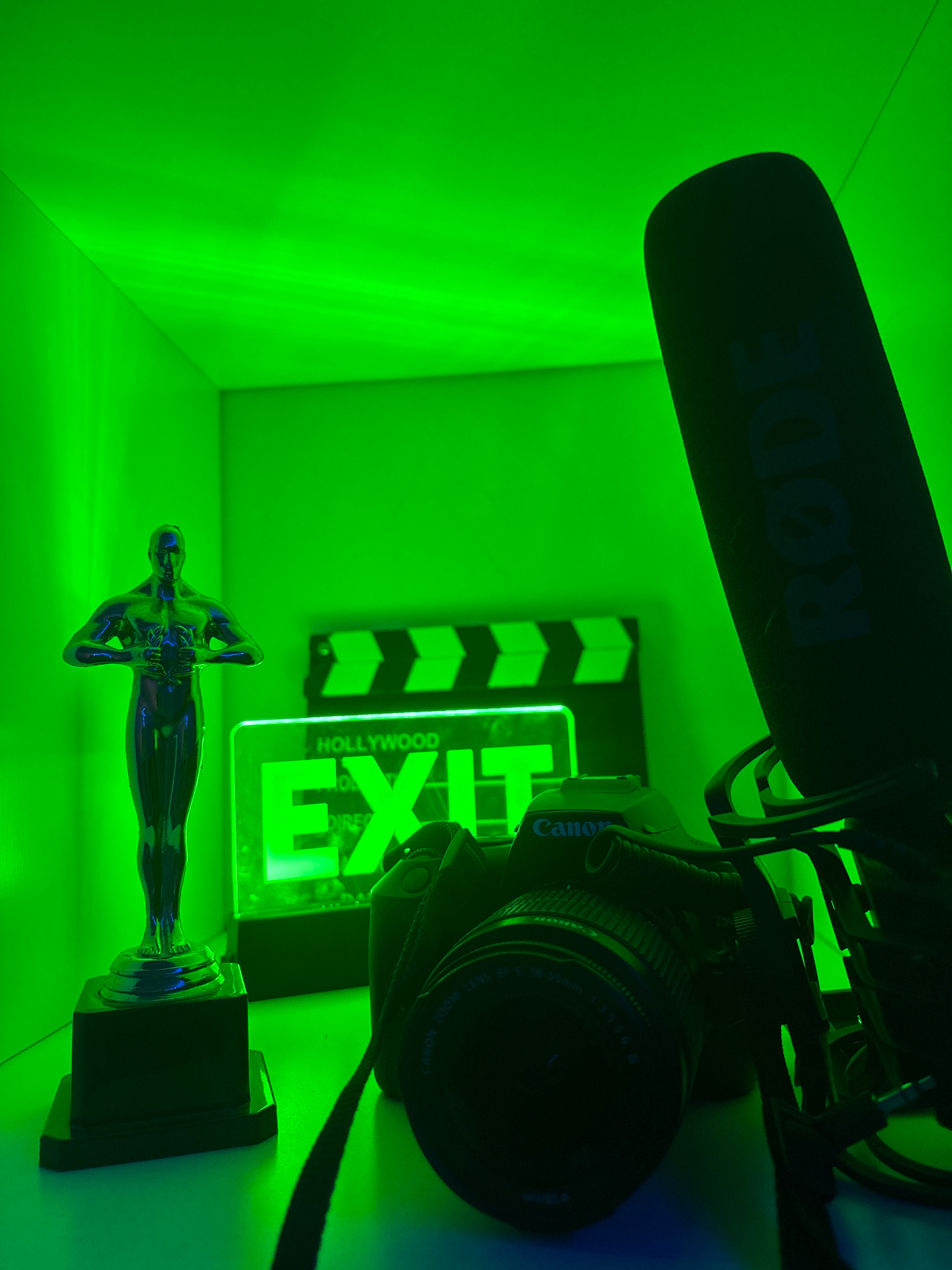 A still life composition featuring film-related objects illuminated with green light. A Rode microphone with a wind screen is at the upper left, mounted on a Canon DSLR camera with an 18-55mm lens. Be…read more