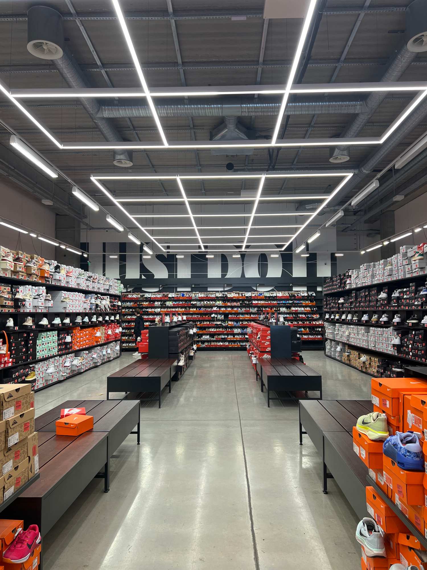 The image captures an interior view of a retail establishment, likely a shoe store, specifically a Nike outlet. Rows of shelves laden with shoe boxes extend into the distance, their colors ranging fro…read more