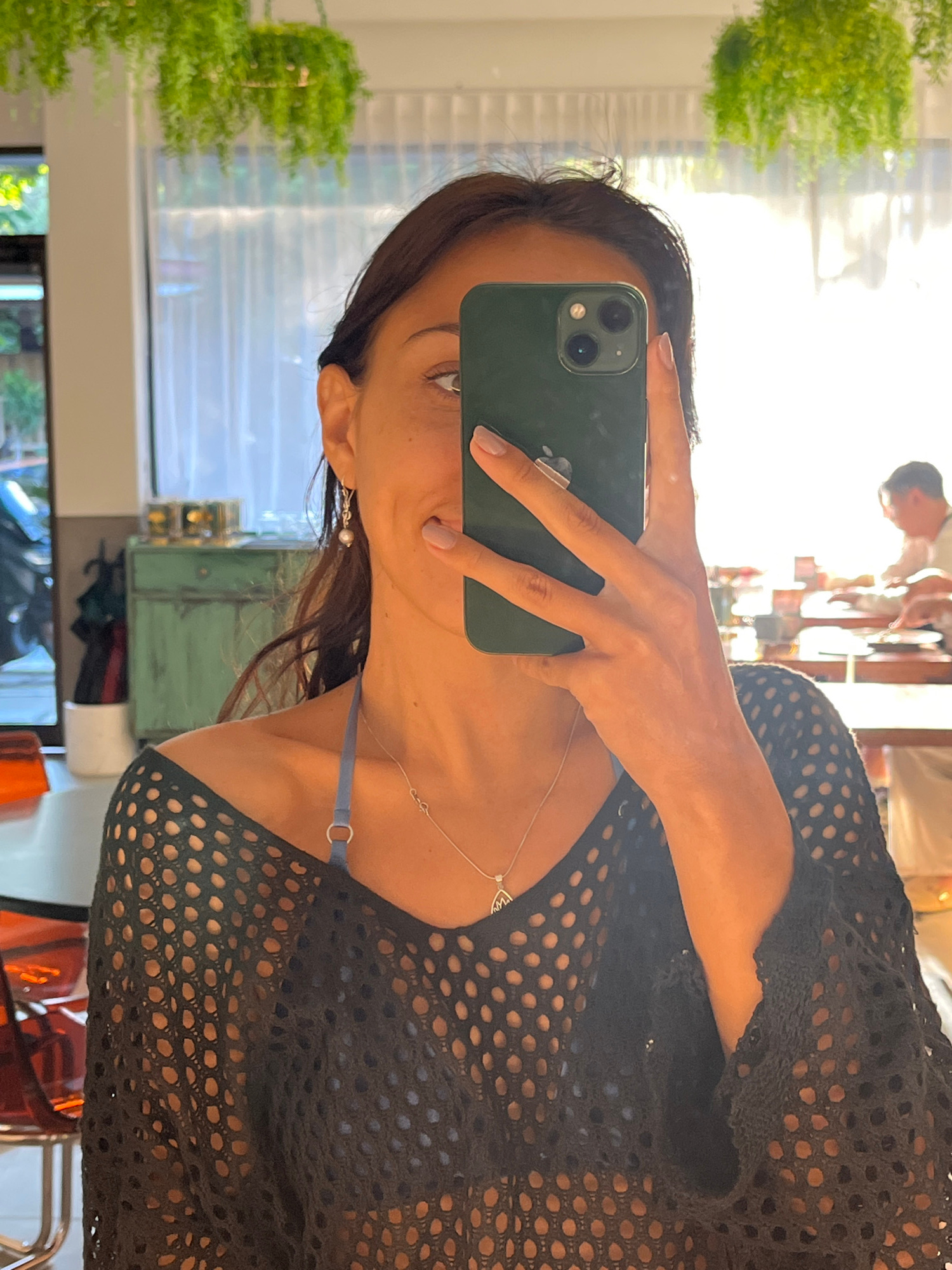 A woman is captured taking a mirror selfie, holding a dark green smartphone (likely an iPhone) with her right hand. Her face is partially visible in the reflection, showing one eye looking towards the…read more