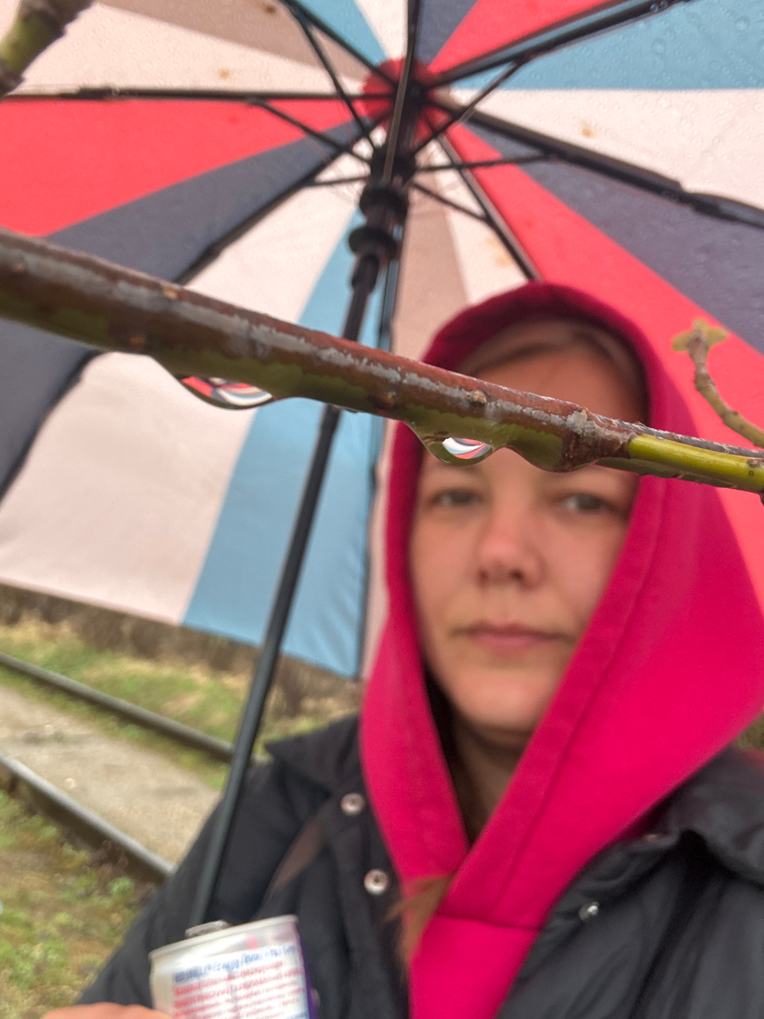 A close-up shot focuses on a wet tree branch with two prominent raindrops clinging to it. Through the raindrops, the reflection of a multi-colored umbrella can be seen, suggesting a rainy day. In the…read more