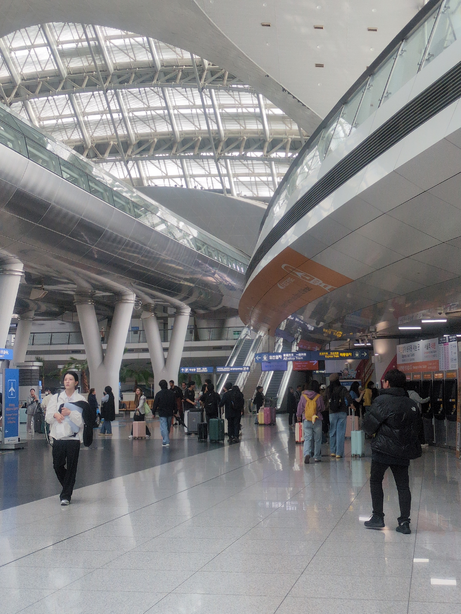 The image depicts a group of people standing in line at Incheon International Airport in Incheon, South Korea. The scene is indoors, likely in a terminal or waiting area. The architecture is modern, w…read more