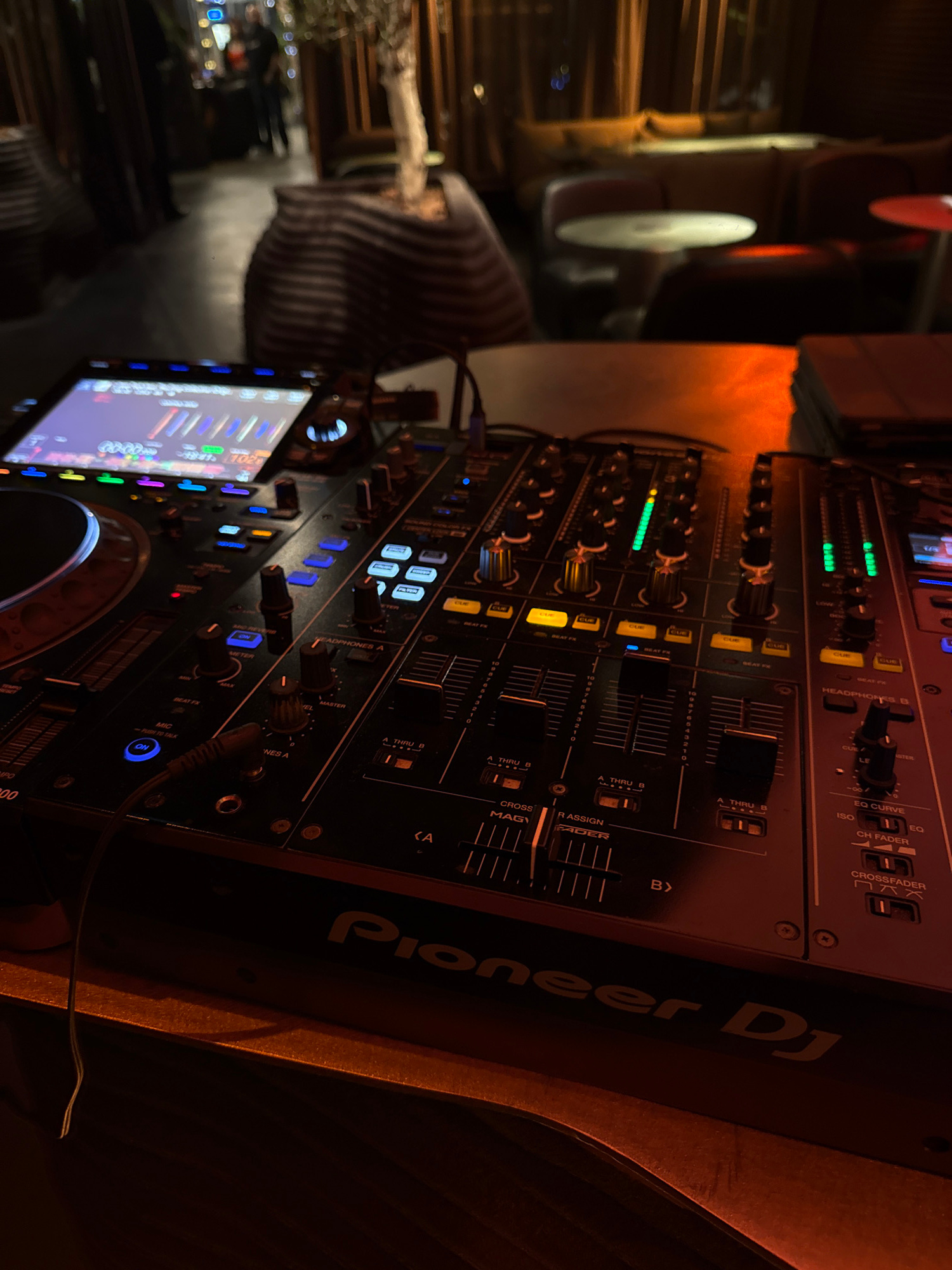 The image showcases a Pioneer DJ setup, likely a mixer and turntable combination, positioned on a surface that appears to be part of a DJ booth or performance area. The equipment is illuminated by war…read more