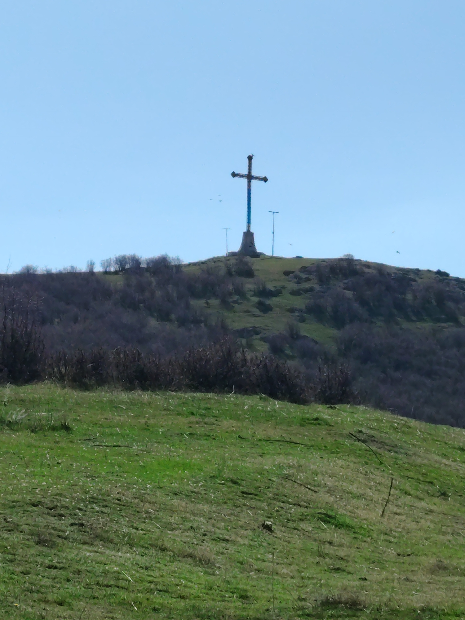 The image depicts a large Christian cross situated on the summit of a hill. The cross is dark in color with what appears to be a blue accent running up the vertical portion of the cross. The hill is c…read more