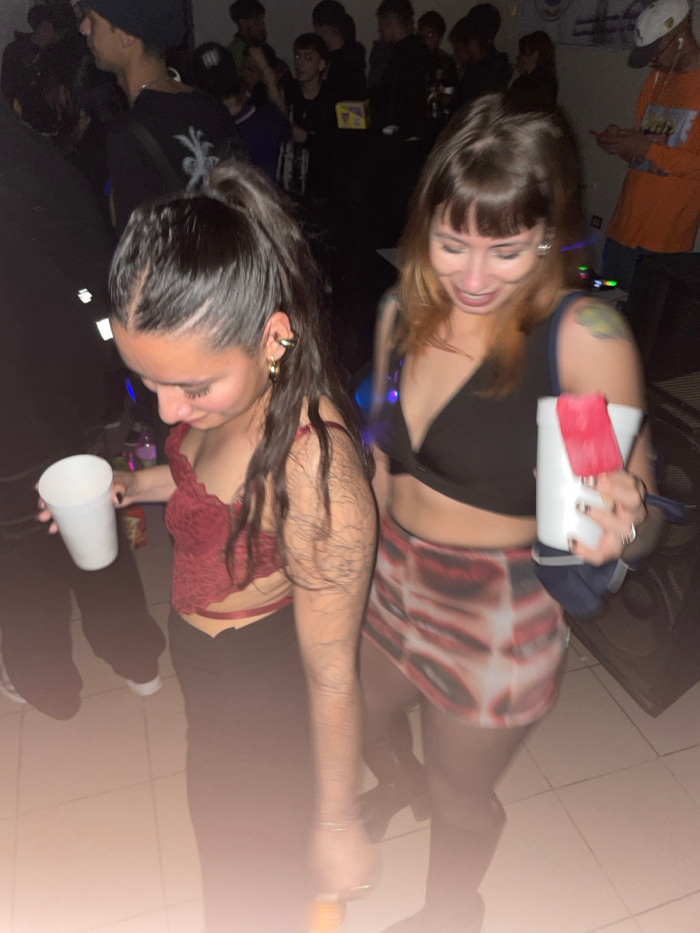 The image depicts an indoor social gathering, likely a party or club, in Ushuaia, Argentina, under dim lighting. Two women are prominently featured in the foreground, with numerous other individuals b…read more