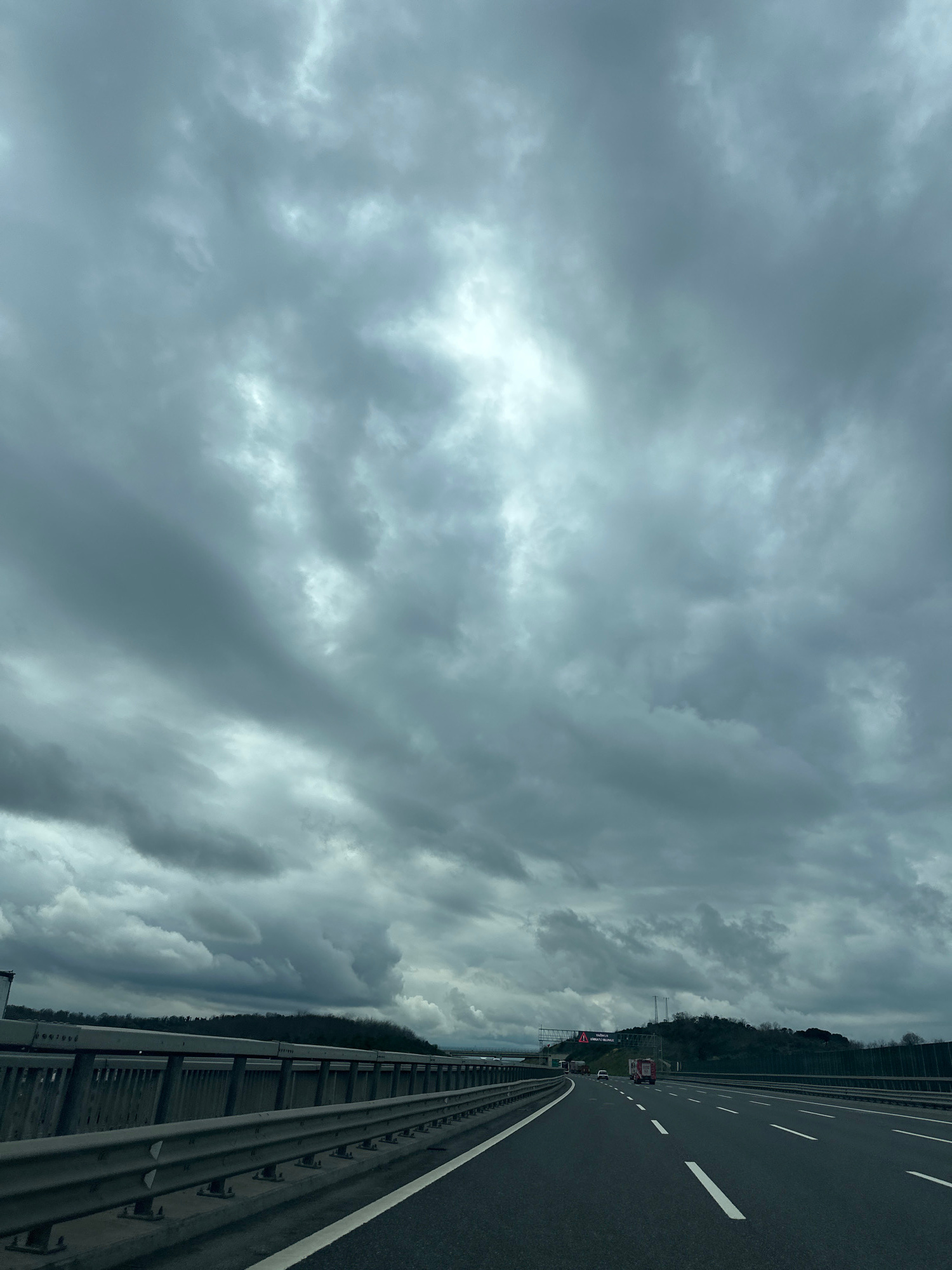 The image shows a section of a highway under a heavily overcast sky. The location is in Sarıyer, Turkey. A concrete barrier separates the highway from the adjacent land, which appears to be forested.…read more
