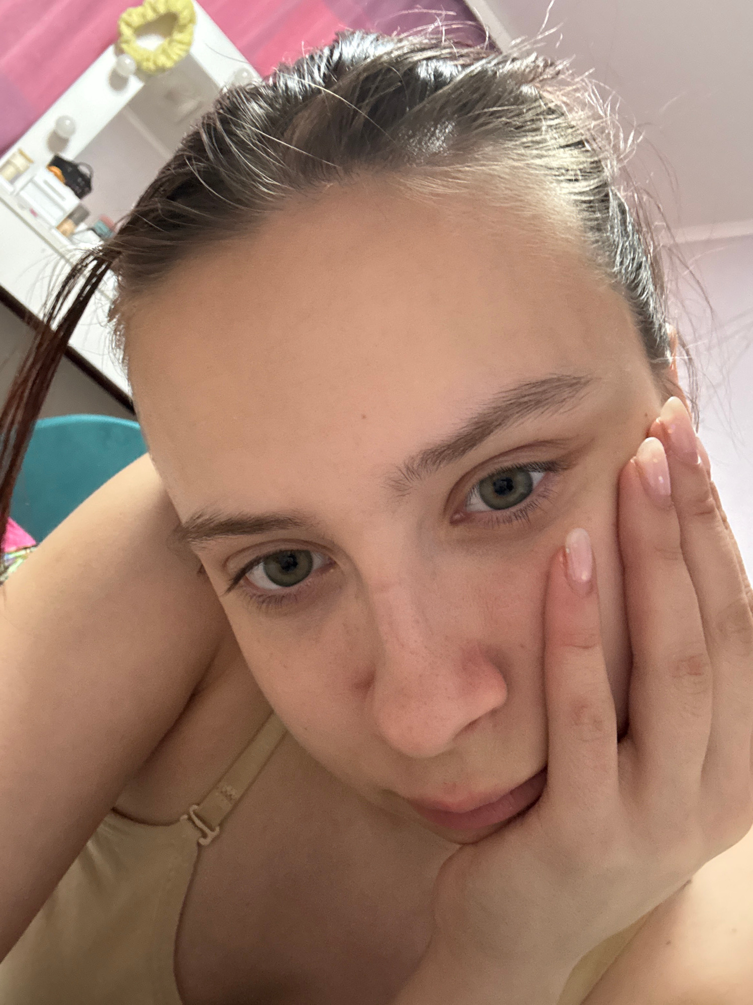 A close-up photograph shows a person's face partially obscured by their hand. The individual has fair skin, light eyebrows, and green eyes. The hair appears wet or damp. The hand is positioned near th…read more
