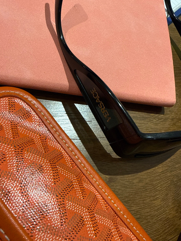 A close-up shot captures a stylish tableau. Black Versace sunglasses rest atop a salmon-colored book or notebook. An orange Goyard wallet or pouch, edged with meticulous stitching, fills the lower rig…read more