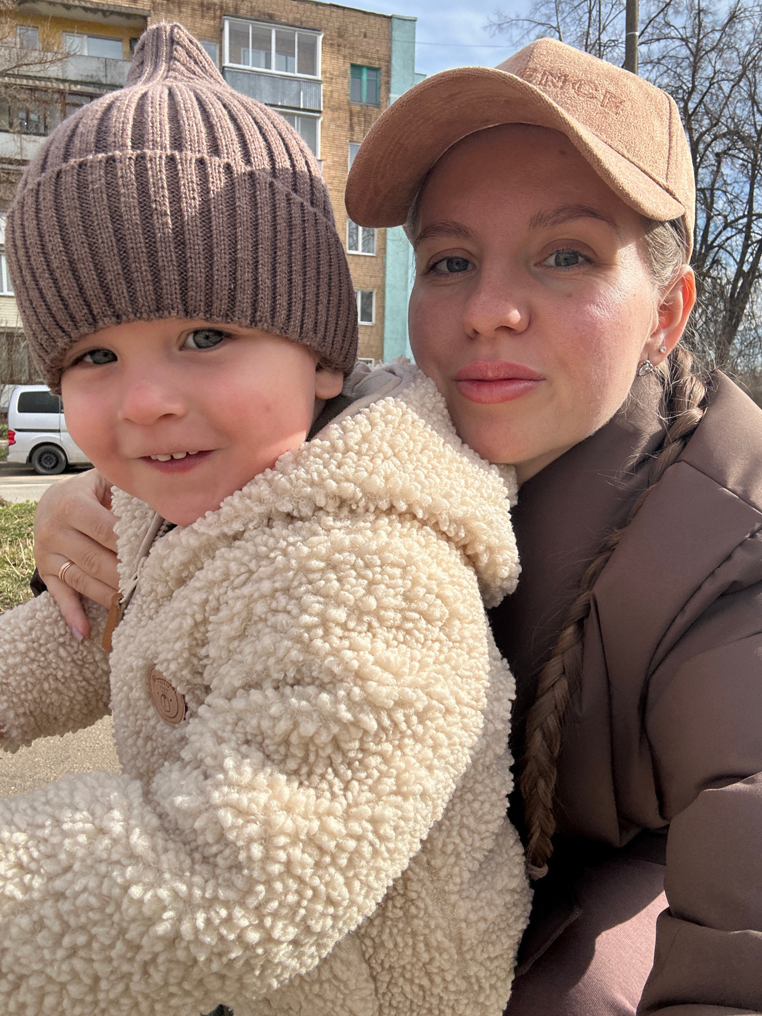 A selfie captures two people outdoors. An adult, presumably a woman, wears a brown jacket and a matching cap. Her blonde hair is braided. A child, likely a boy, is nestled in a white sherpa-style jack…read more