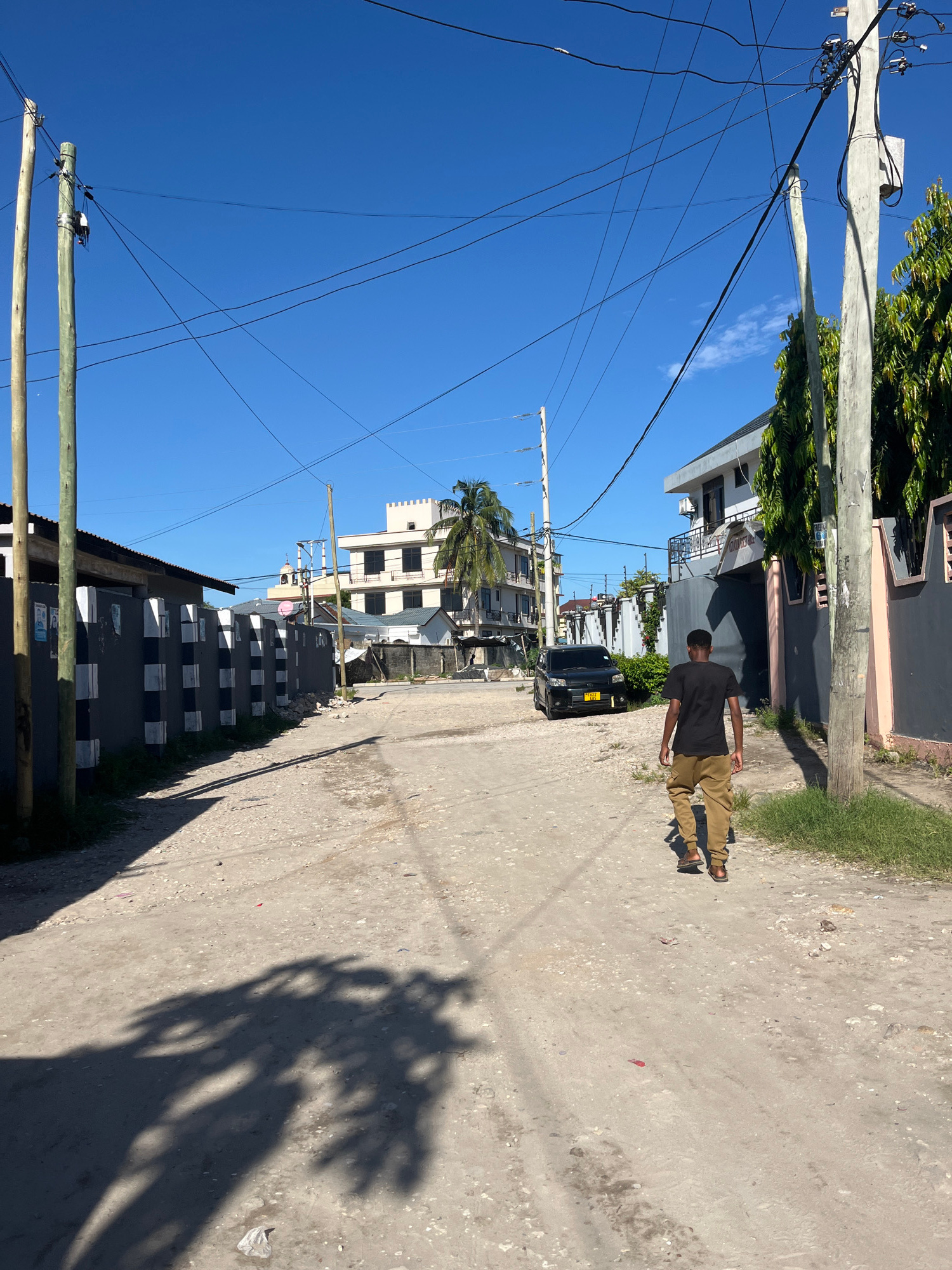 The image depicts a street scene in Dar es-Salaam, Tanzania, under a bright blue sky with visible power lines. A person wearing a dark shirt and tan pants is walking along a dirt and paved road. Build…read more