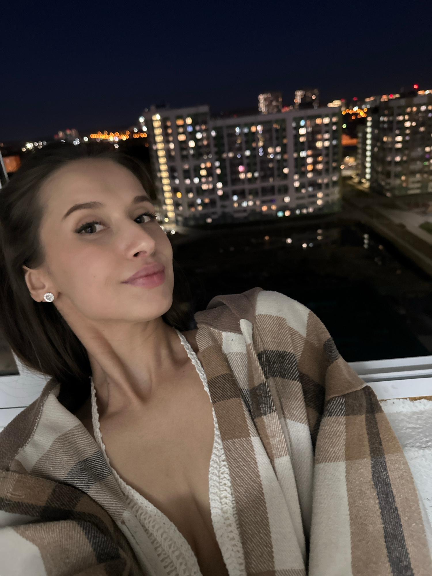 A woman is in the lower right of the image, in a vertical format. She has fair skin, dark eyebrows, and light pink lips. She is wearing a white top and a brown and white plaid blanket or shawl is drap…read more