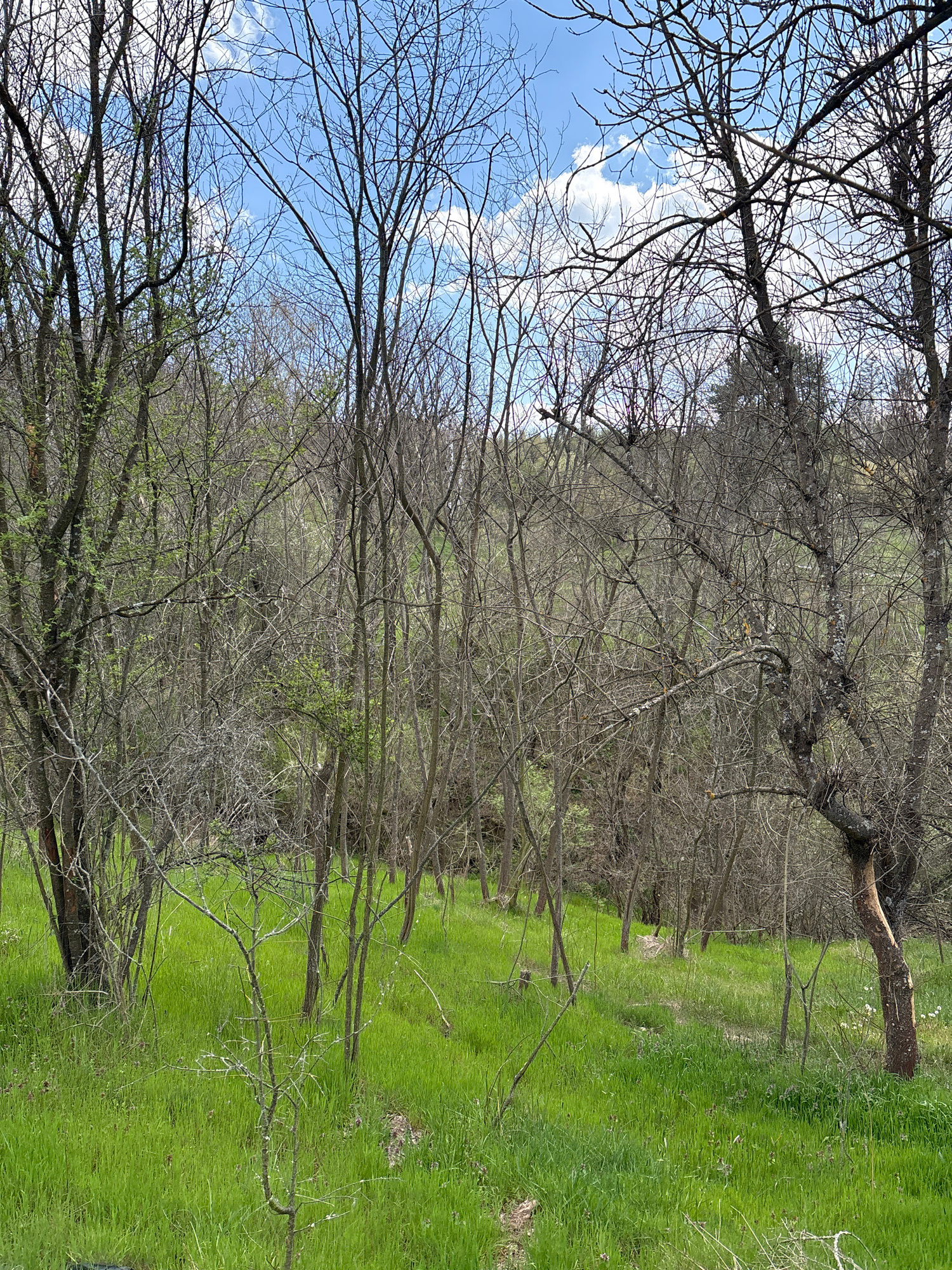 The image depicts a line of bare trees alongside a field of green grass, likely in early spring. Patches of blue sky are visible through the branches. The exact location within Panagyurishte, Bulgaria…read more