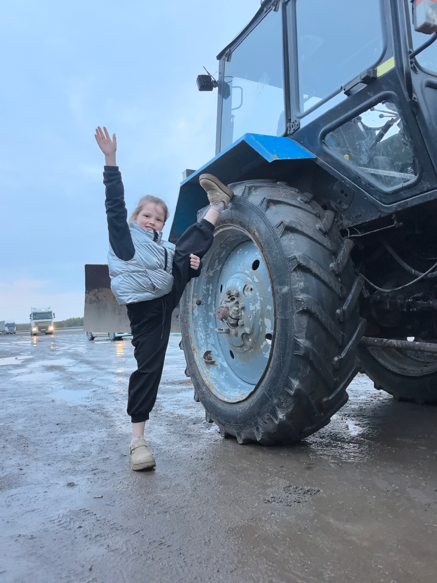 A young girl in a silver puffer vest and black pants is performing a split next to a large blue tractor. Her right leg is resting on the tire of the tractor, while her left arm is raised in the air. T…read more