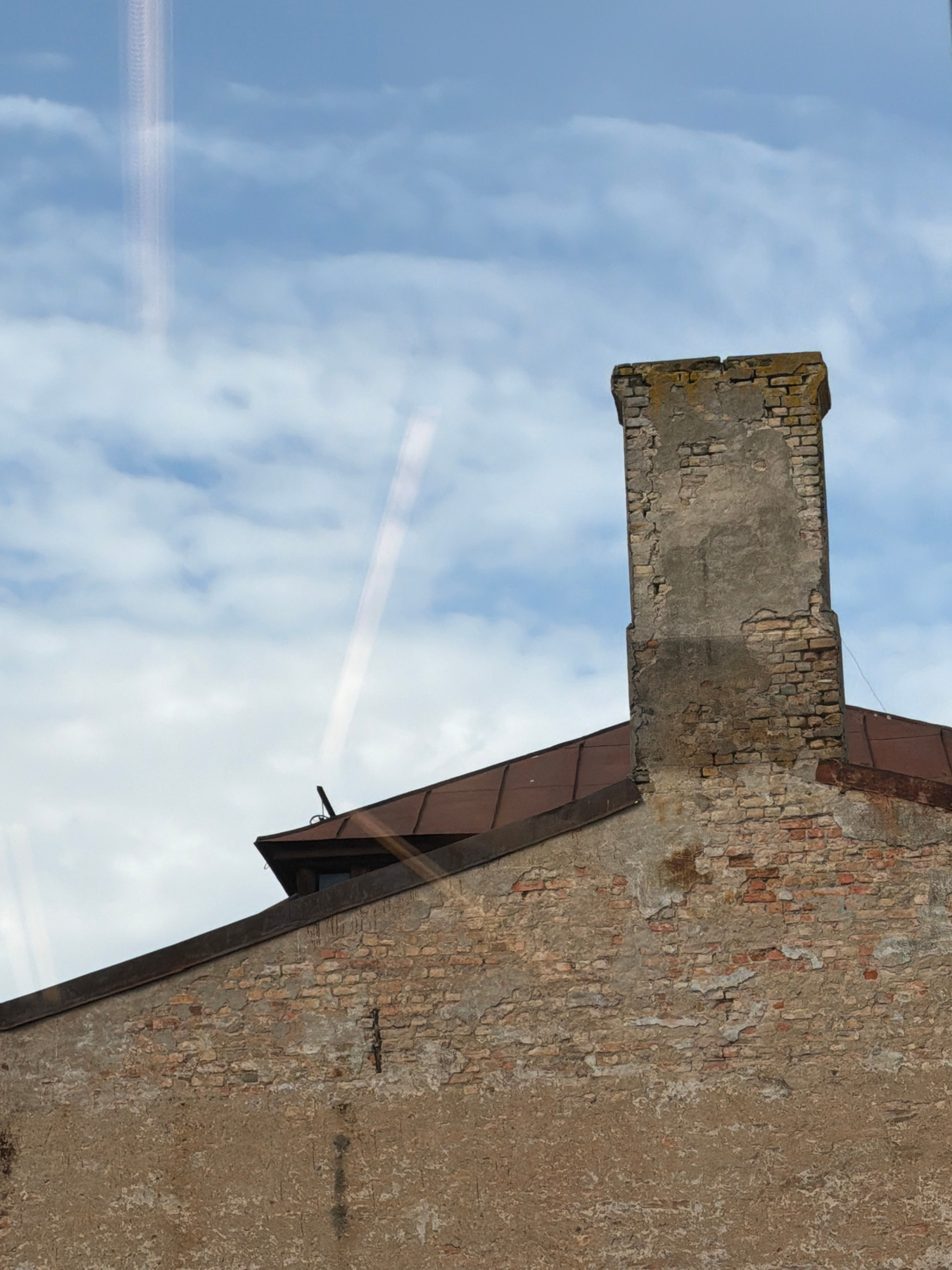 An old, weathered brick building stands under a partly cloudy daytime sky. The image is taken at an upward angle, focusing on the upper part of the structure. The building's facade is heavily worn, wi…read more