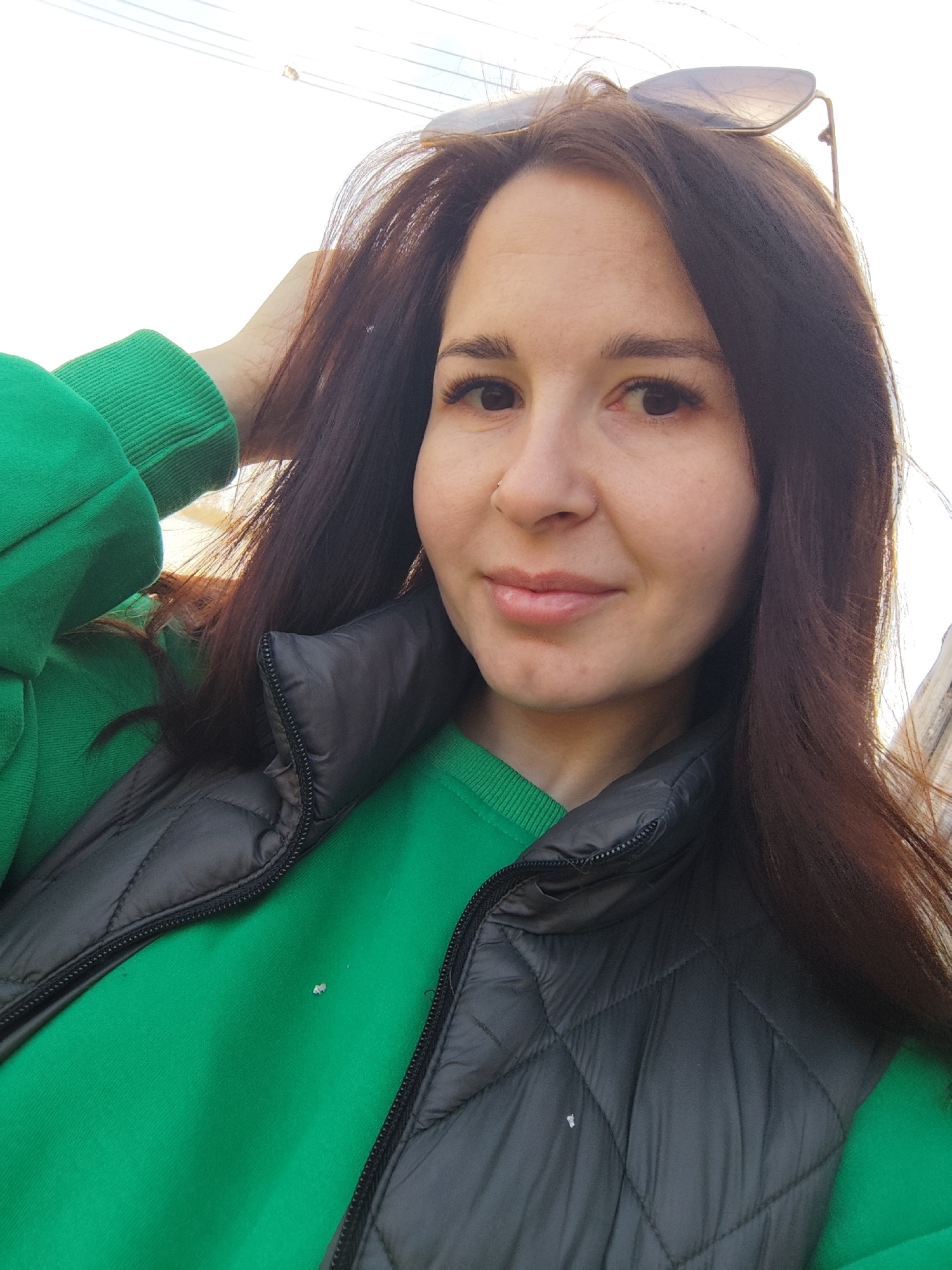 A young woman is posing for a selfie, outdoors, with her hand running through her brown hair. She is wearing sunglasses perched on her head, a green hooded sweatshirt, and a black quilted vest. The lo…read more