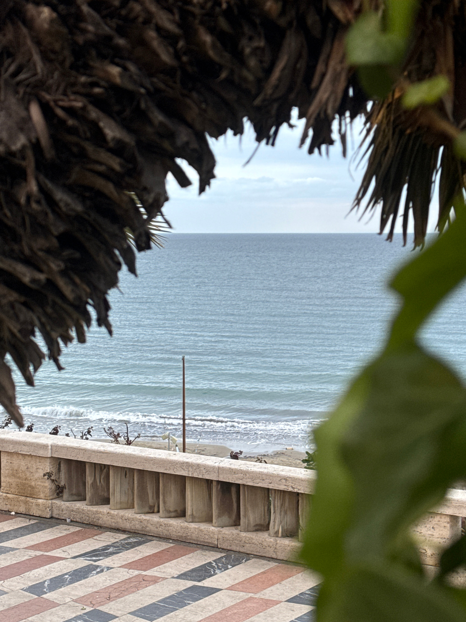 A view of the sea is framed by vegetation. In the foreground, on the left, is a section of a palm tree trunk. On the right, a portion of a tiled walkway leads to a low stone wall, beyond which is theβ¦read more