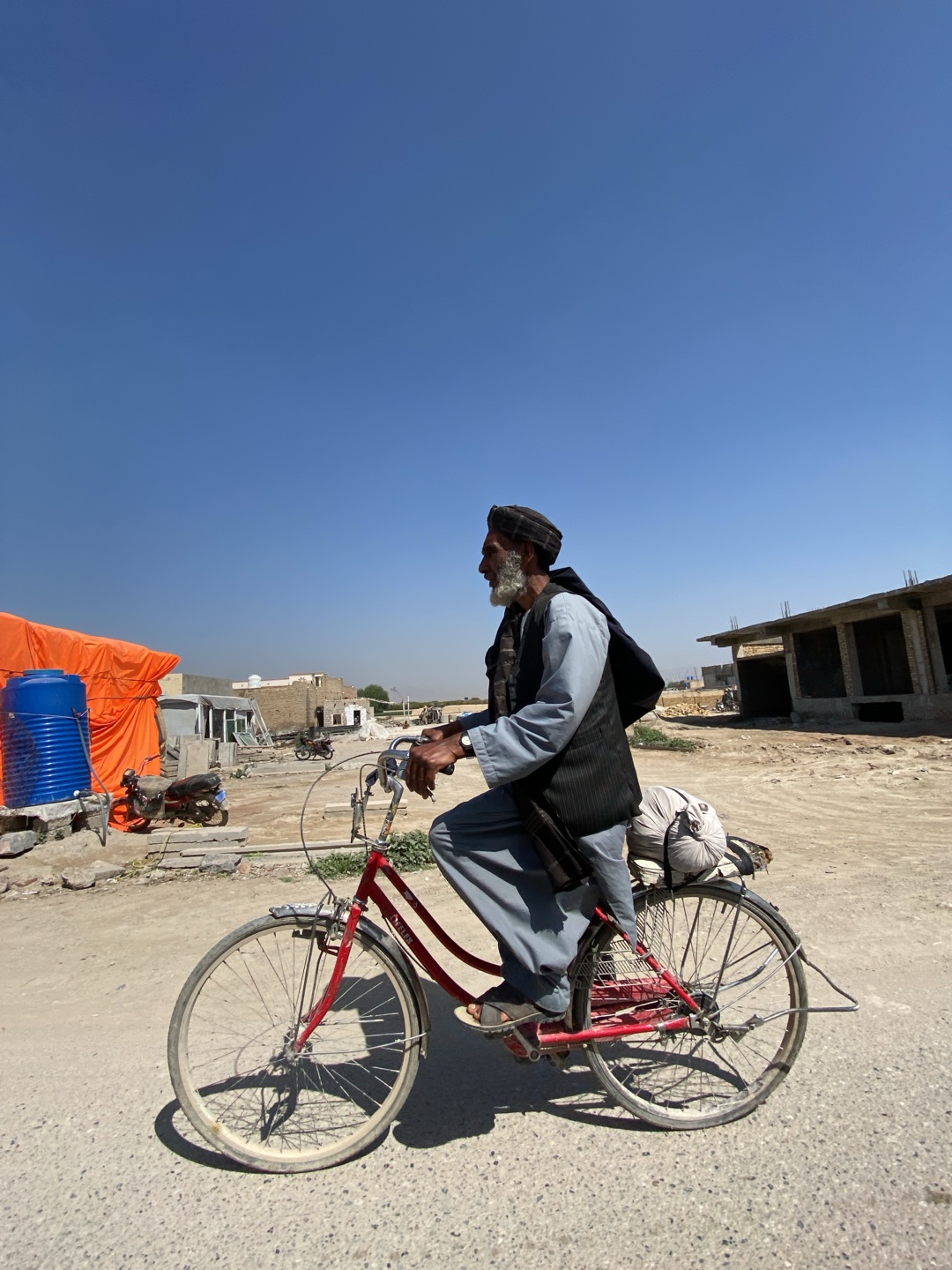 A man rides a red bicycle on a dirt road in Kandahar, Afghanistan. The man has a long white beard and wears a black hat, light blue long-sleeved shirt, black vest, and baggy grey pants. He has a large…read more