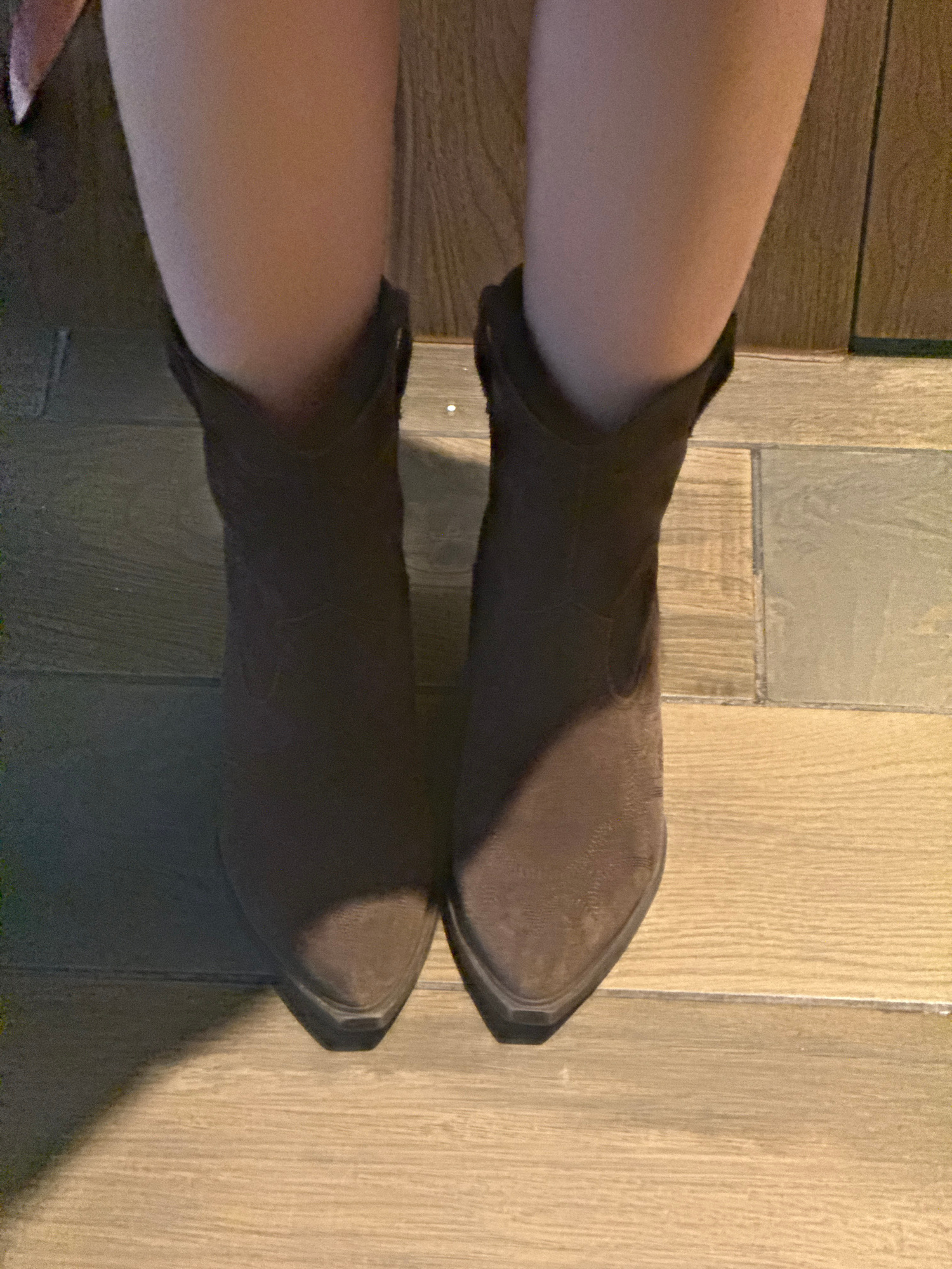 A low-angle, indoor shot depicts two legs wearing ankle boots, presumably on a person. The legs are positioned horizontally across the frame. The boots are a dark brown color with a pointed toe. The b…read more