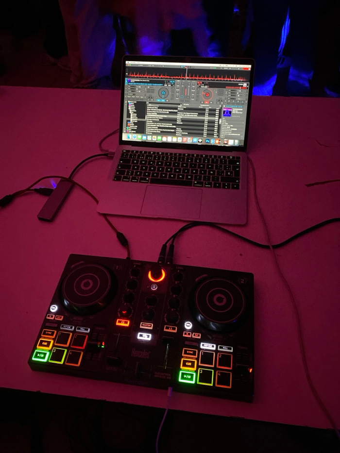 An electronic music setup is positioned on a light-colored, possibly white, flat surface in an indoor location in Ushuaia, Argentina. The scene is primarily illuminated by ambient pink light, with a b…read more