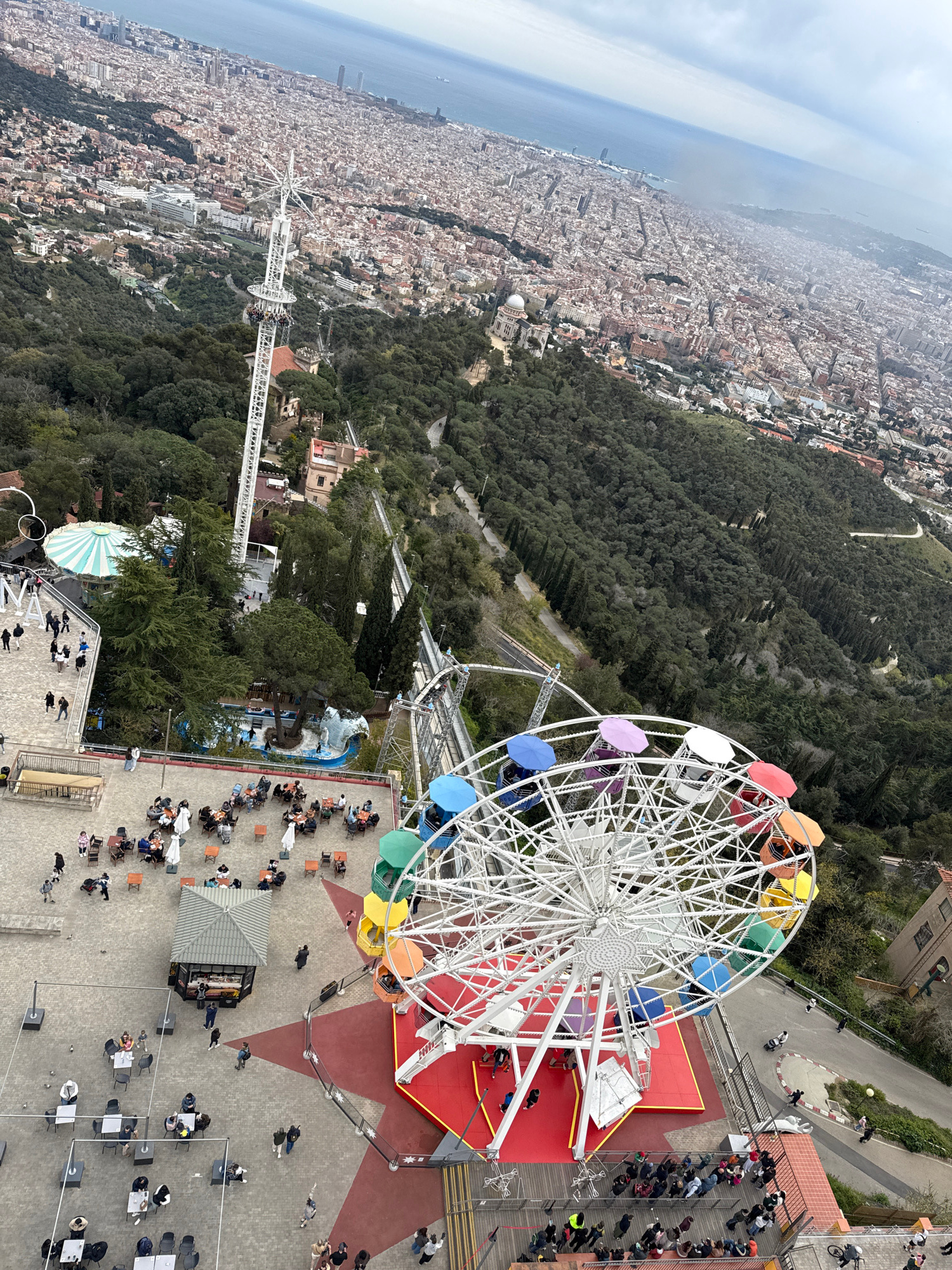The image shows an aerial view of Tibidabo Amusement Park in Barcelona, Spain. A colorful Ferris wheel is a prominent feature. Below, people are seated at tables and queuing in a roped off area. A rol…read more
