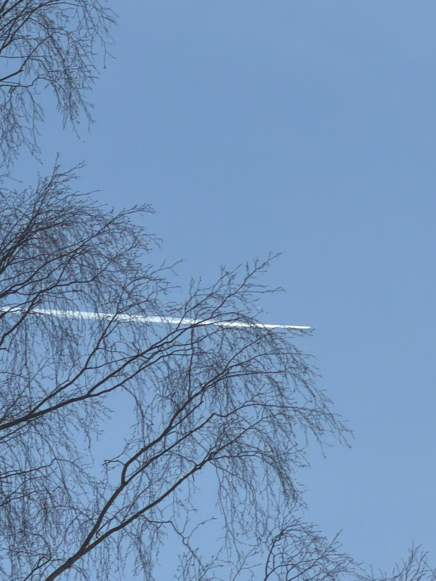 The image depicts a blue sky with a prominent contrail bisecting the frame. Bare branches of trees fill the foreground and right side of the image. There is no discernible information to ascertain theβ¦read more