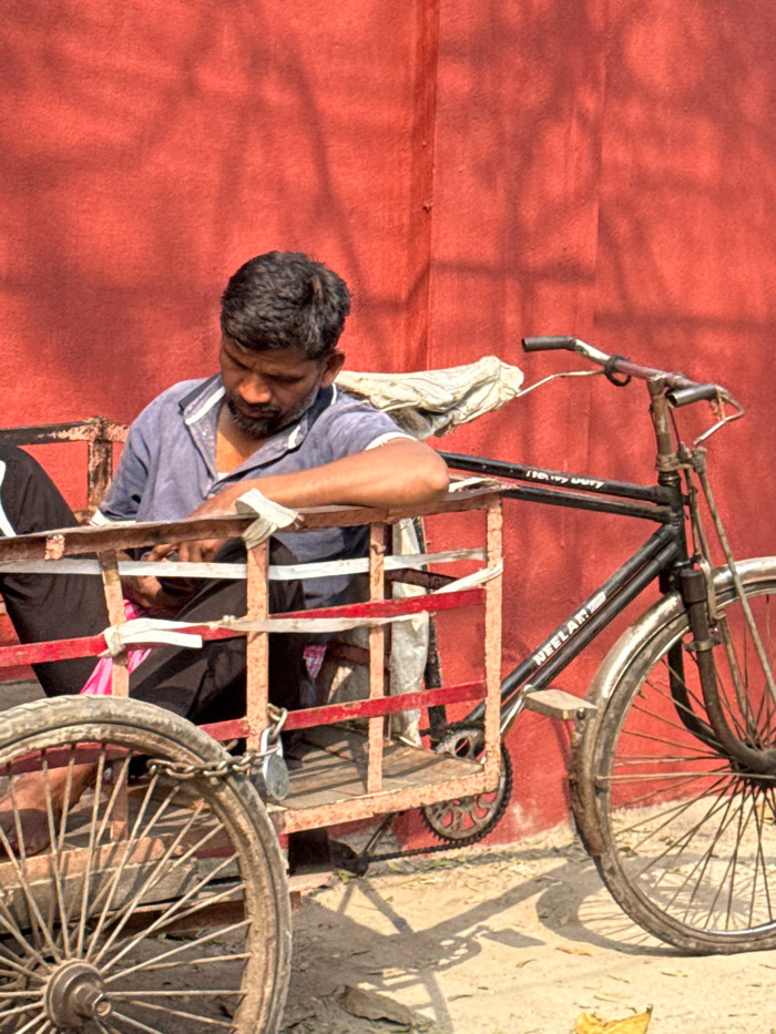A man in a light blue shirt is positioned on a cart attached to a bicycle. The cart is made of rusted metal. The man is partially inside the cart, with his head visible. The bicycle is leaning againstβ¦read more