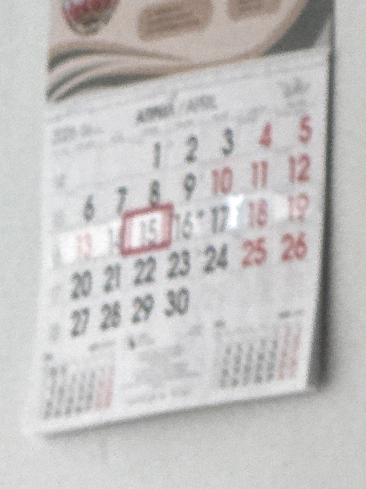 A blurry image shows part of a calendar. The calendar is oriented at an angle, such that the bottom right corner is closer to the viewer. The month is April. The numbers 1-5 are on the first row. The…read more