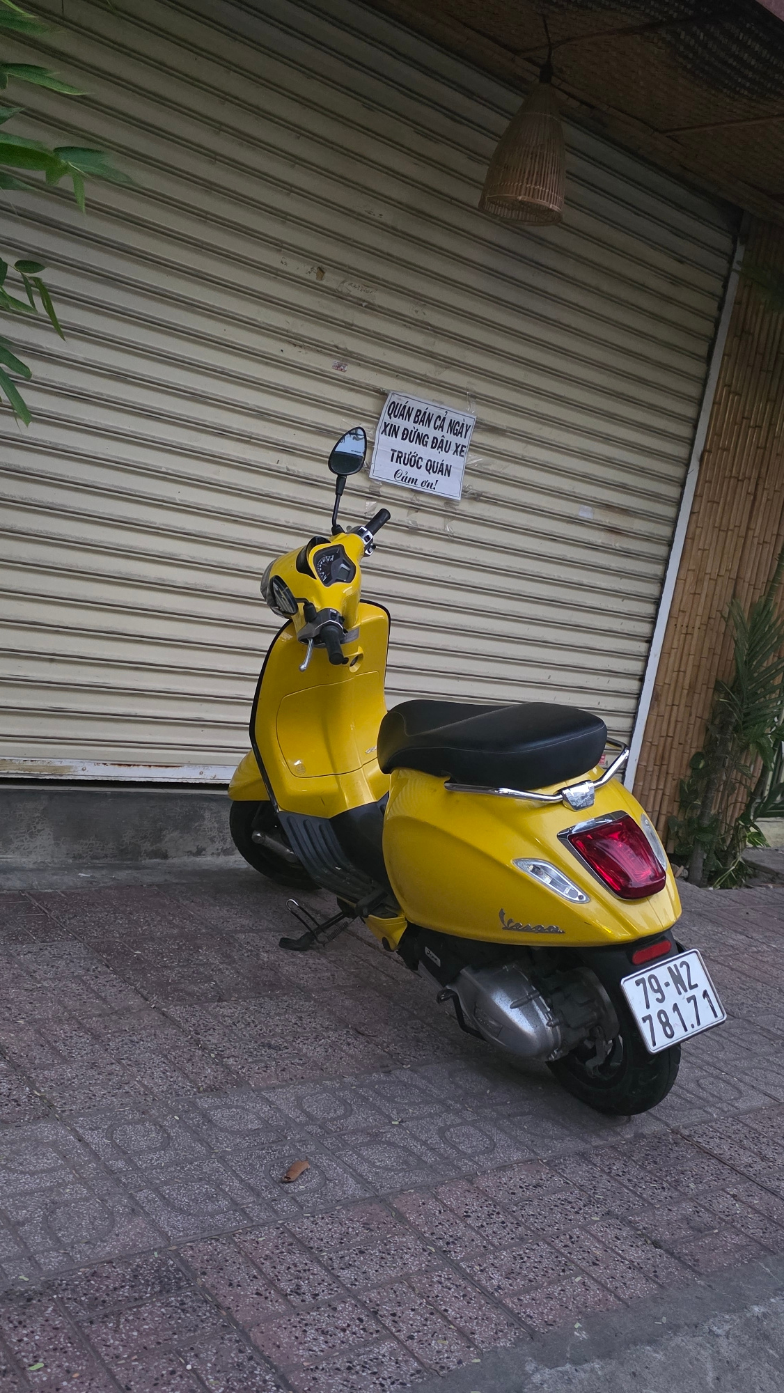 A yellow Vespa scooter is parked diagonally on a brick sidewalk next to a corrugated metal roll-up door, seemingly in front of a shop in Nha Trang, Vietnam. A small sign is taped to the door with Viet…read more