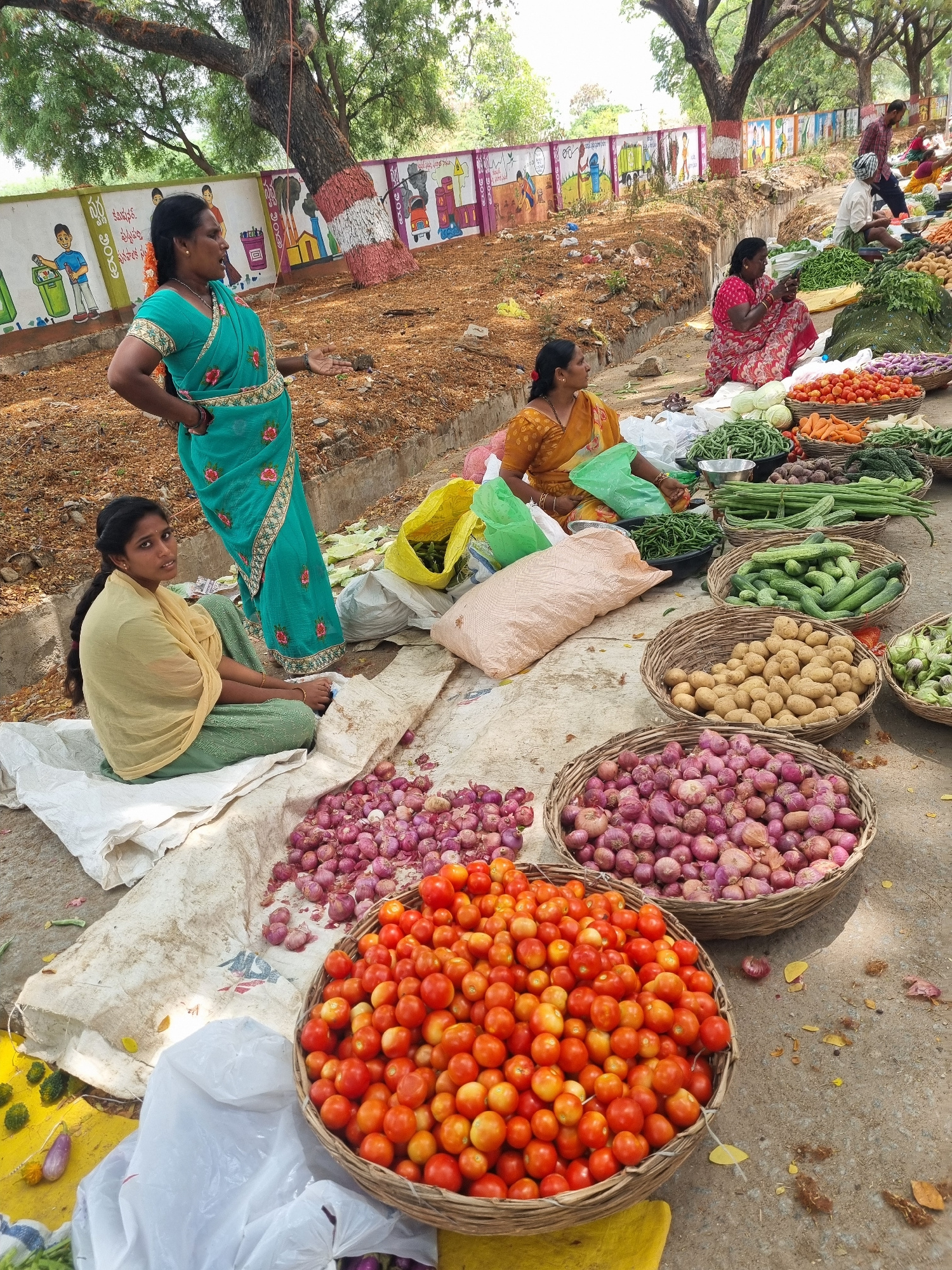 The image depicts a roadside vegetable market in Puttaparthi, India. Several women are sitting on the ground, selling various produce arranged in baskets and on tarps. The produce includes tomatoes, o…read more