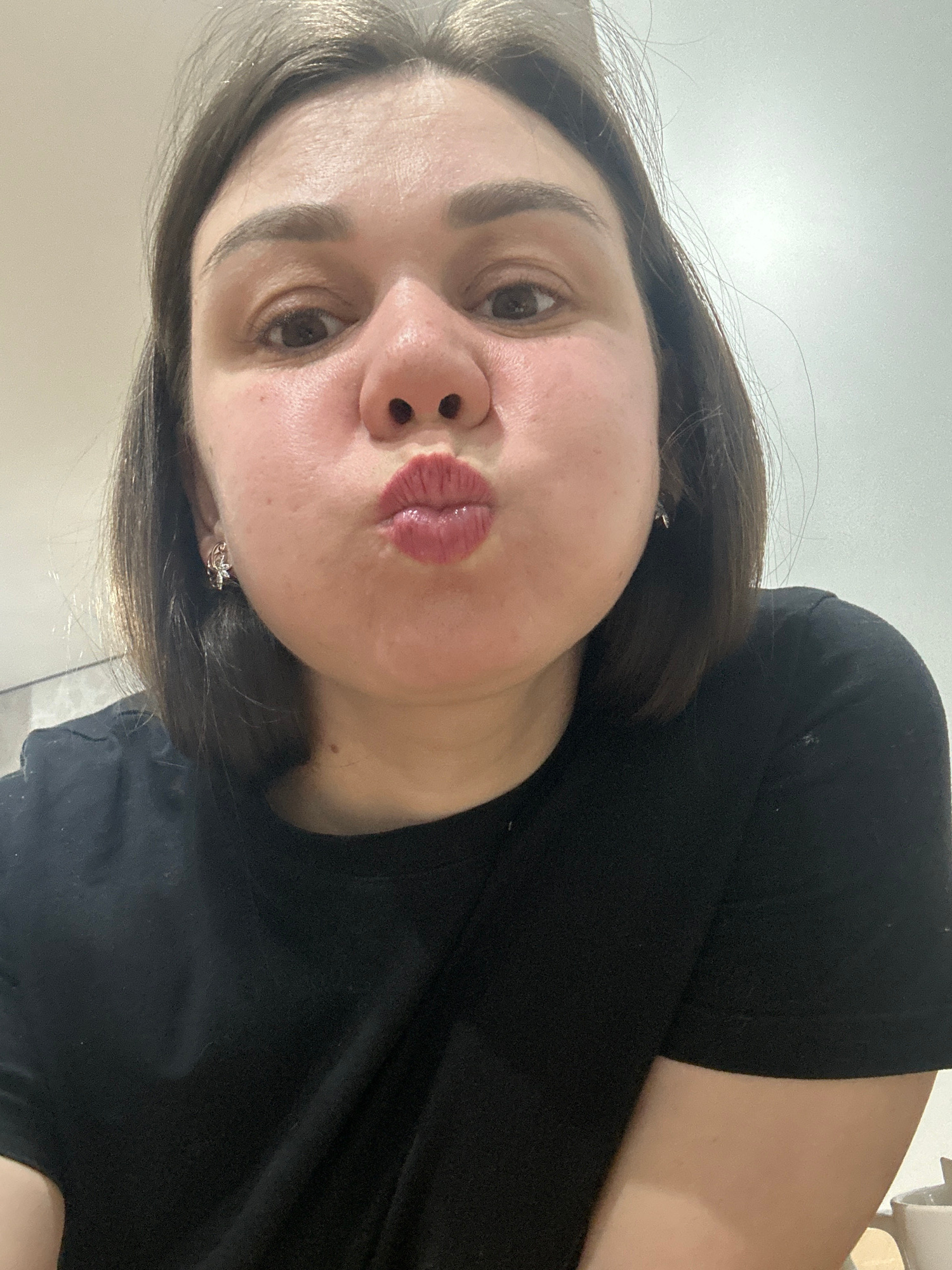 A woman with brown hair and brown eyes is looking at the camera with pursed lips. She is wearing a black shirt and earrings. The background is a plain white wall. It is not possible to determine the l…read more