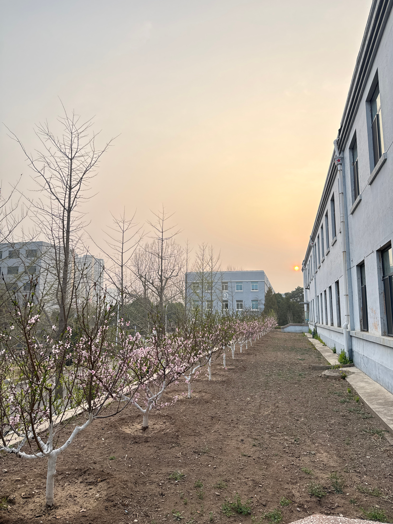 The image presents an outdoor scene in Zhongtun, China. A multi-story building with gray concrete exterior dominates the upper left. The sky is pale yellow, possibly due to the sun or haze. A row of t…read more