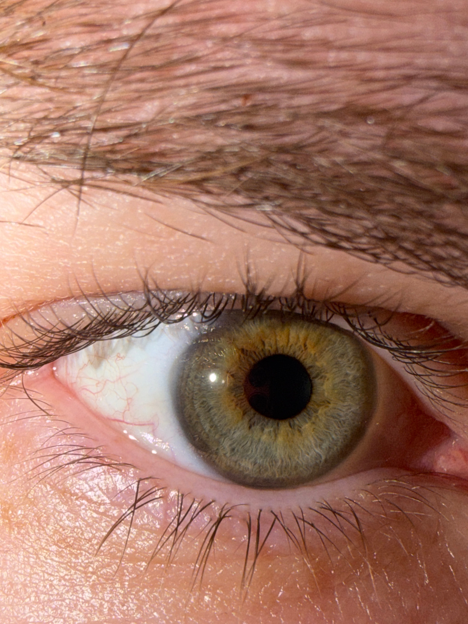 Close-up photograph of a human eye, exhibiting a dark pupil surrounded by a hazel/green iris. Eyelashes are visible on the upper and lower lids. The sclera appears white with prominent blood vessels.…read more