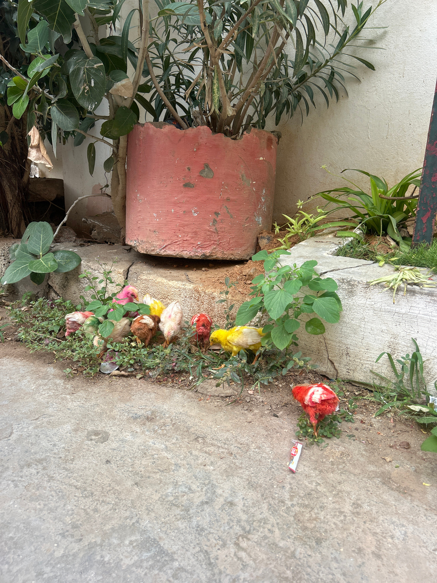 The image displays an outdoor scene in Puttaparthi, India, at ground level. Approximately eight to nine young chicks, exhibiting varied colorations including pink, yellow, red, and white with brown ma…read more