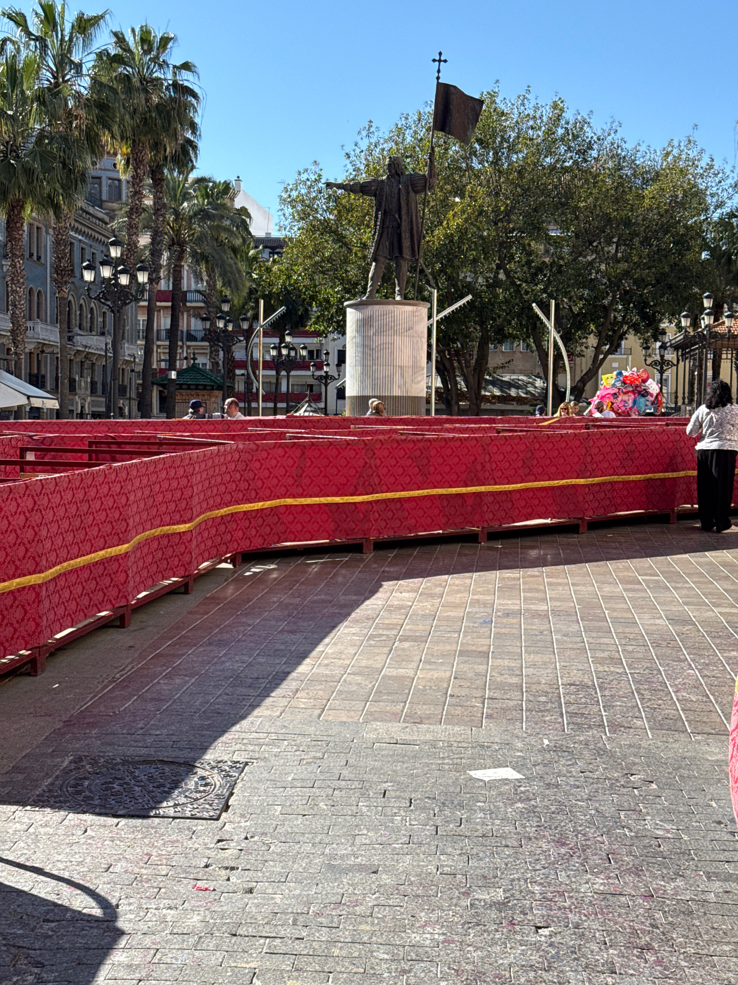 The image depicts a street scene in Huelva, Spain. A red barrier with a yellow stripe runs along the street, casting a shadow on the paved ground. Palm trees and buildings line the street in the backg…read more
