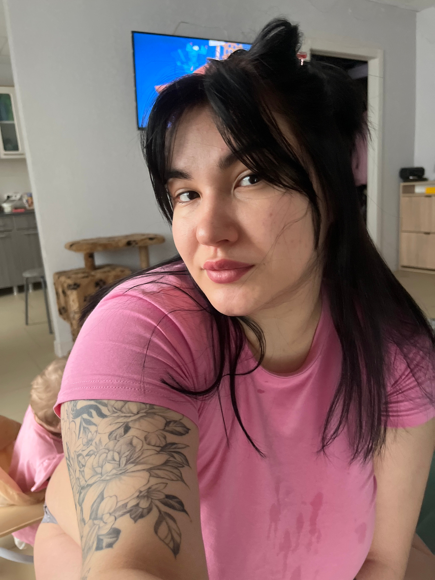 A woman with dark hair, wearing a pink t-shirt and a floral tattoo on her arm, looks at the camera. Sweat stains are visible on the t-shirt. Behind her is a living room with a TV on the wall, a cat tr…read more