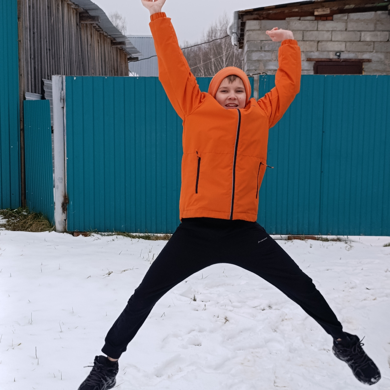 A young person jumps in the air in a snowy, outdoor environment. The individual is wearing an orange hooded jacket and black athletic pants. They have both arms raised above their head and their legs…read more