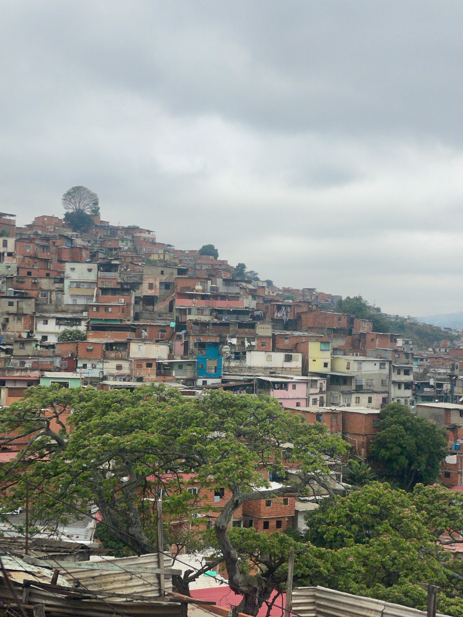 An overcast, grey sky covers the upper half of the image, revealing a densely constructed hillside settlement characteristic of a "barrio" or "rancho" in Caracas, Venezuela. The scene depicts a steep…read more
