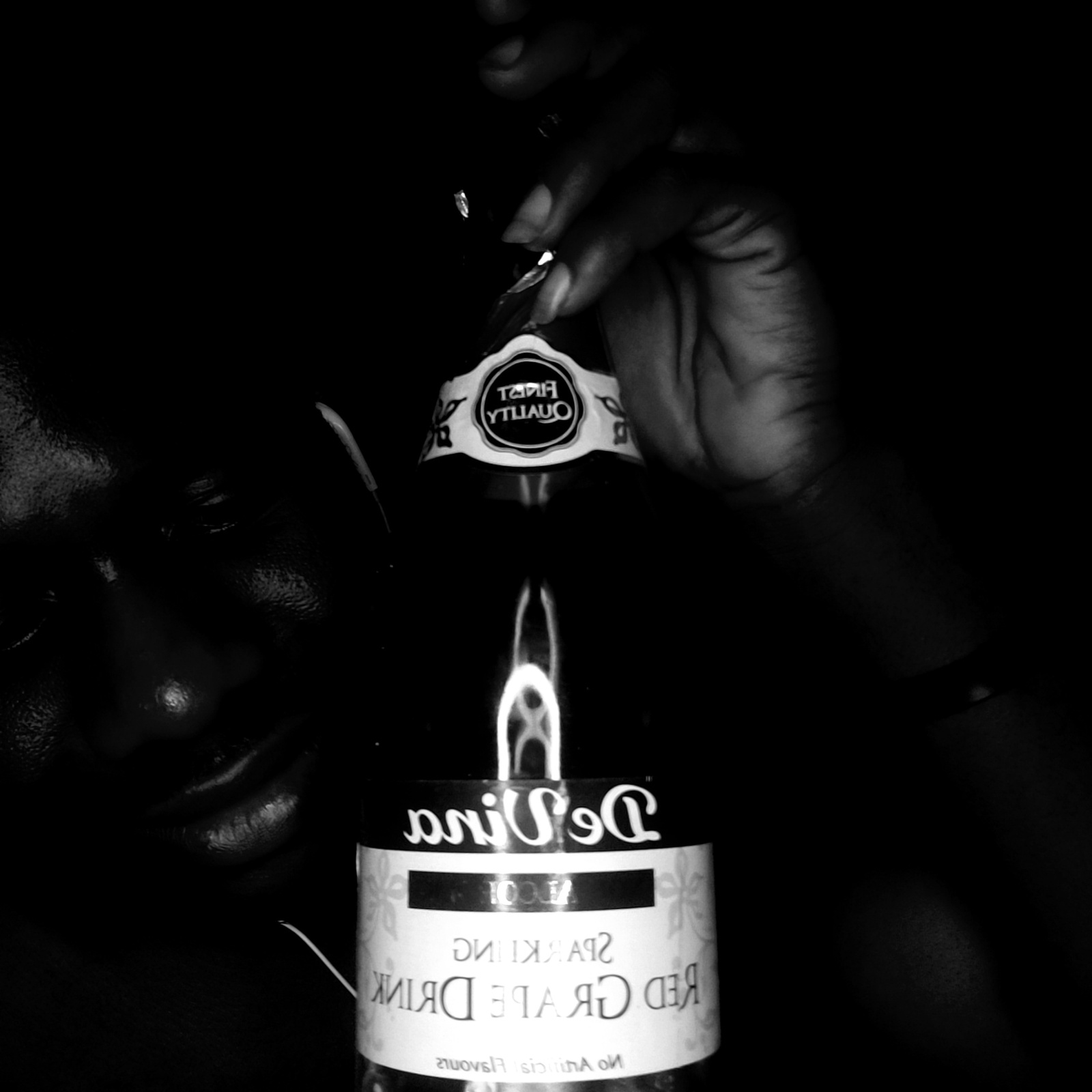 A black and white, horizontally oriented image depicts a partially visible person's face at the bottom, with a hand holding a bottle of "DeSina Red Grape Drink" diagonally across the frame. The backgr…read more