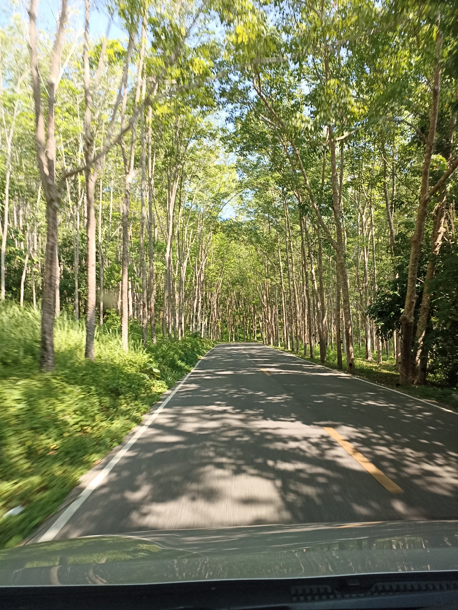The image presents a view from a moving vehicle traveling on a paved road through a dense, green forest or plantation. Tall, slender trees with light-colored trunks line both sides of the road, creati…read more