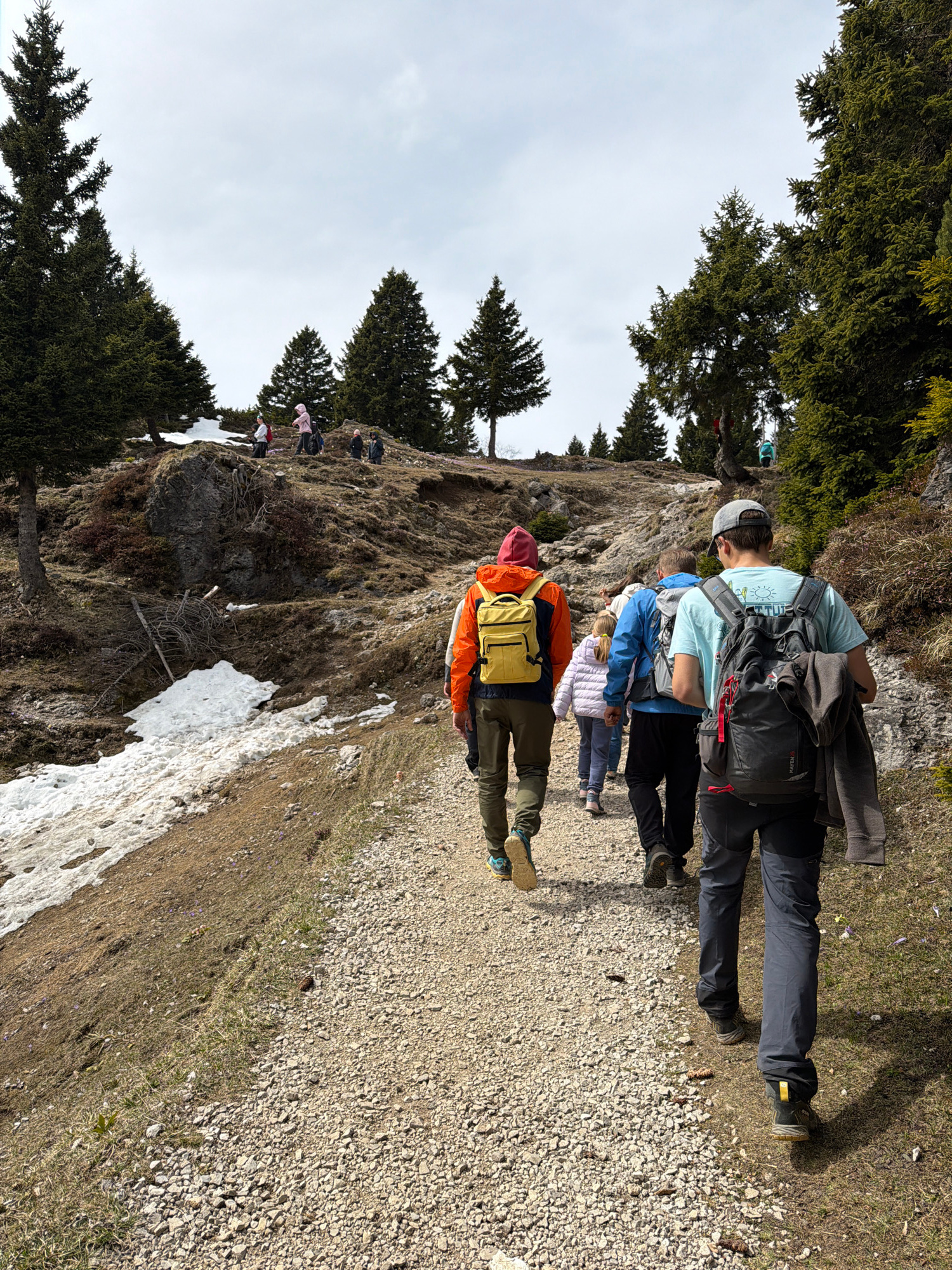 The image shows a group of hikers on a trail in a mountainous region. The location is likely near Kamnik, Slovenia, based on the mountainous terrain and vegetation. A family of hikers are ascending a…read more