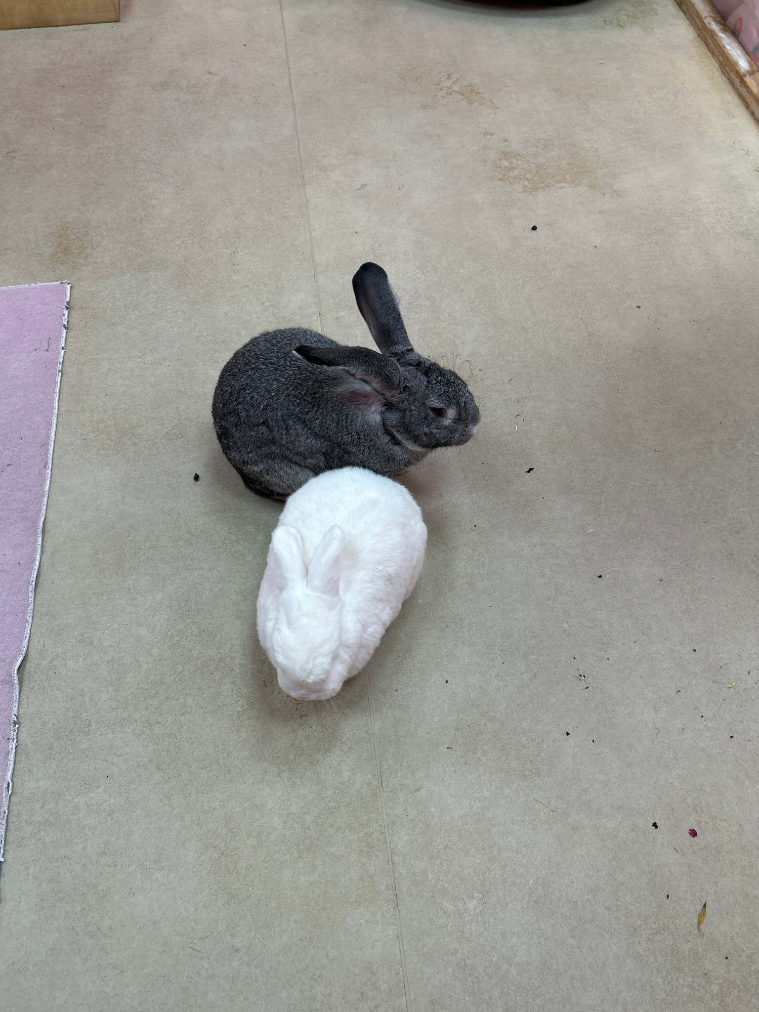 Two small rabbits are shown resting on a light-colored, possibly concrete or linoleum, floor. One rabbit is dark grey and curled up, with its ears visible, appearing to be asleep. Beside it, the seconβ¦read more