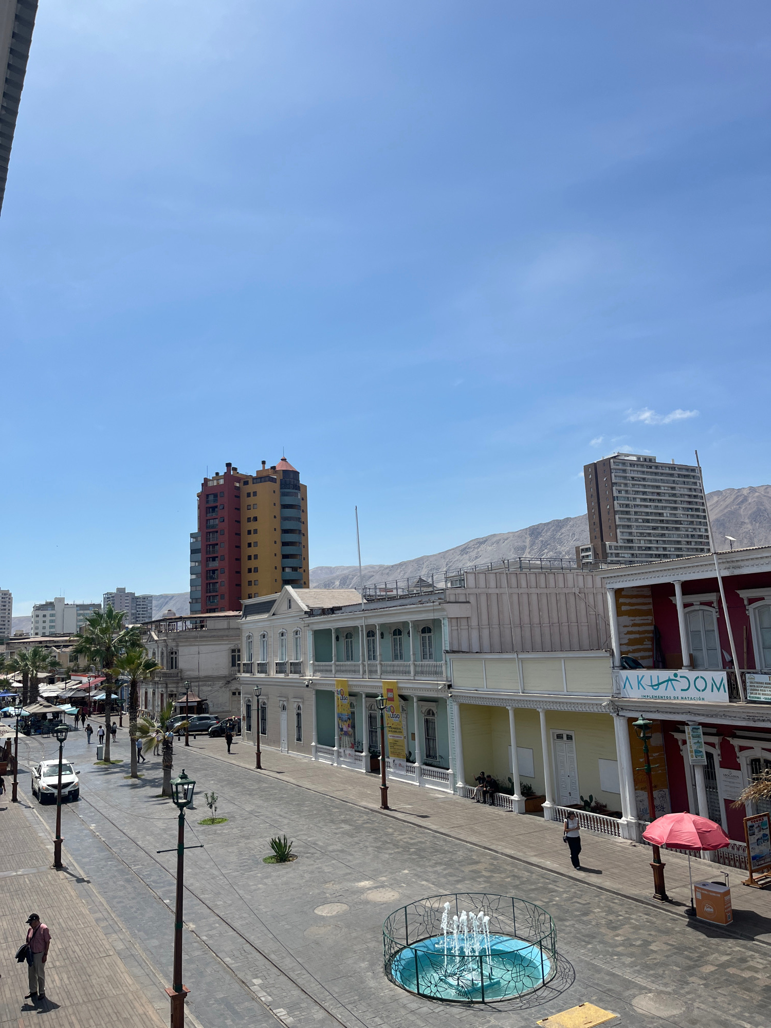 The image depicts a street scene in an urban environment. The location appears to be a coastal city with mountains visible in the background. Several buildings line the street, including a row of whit…read more