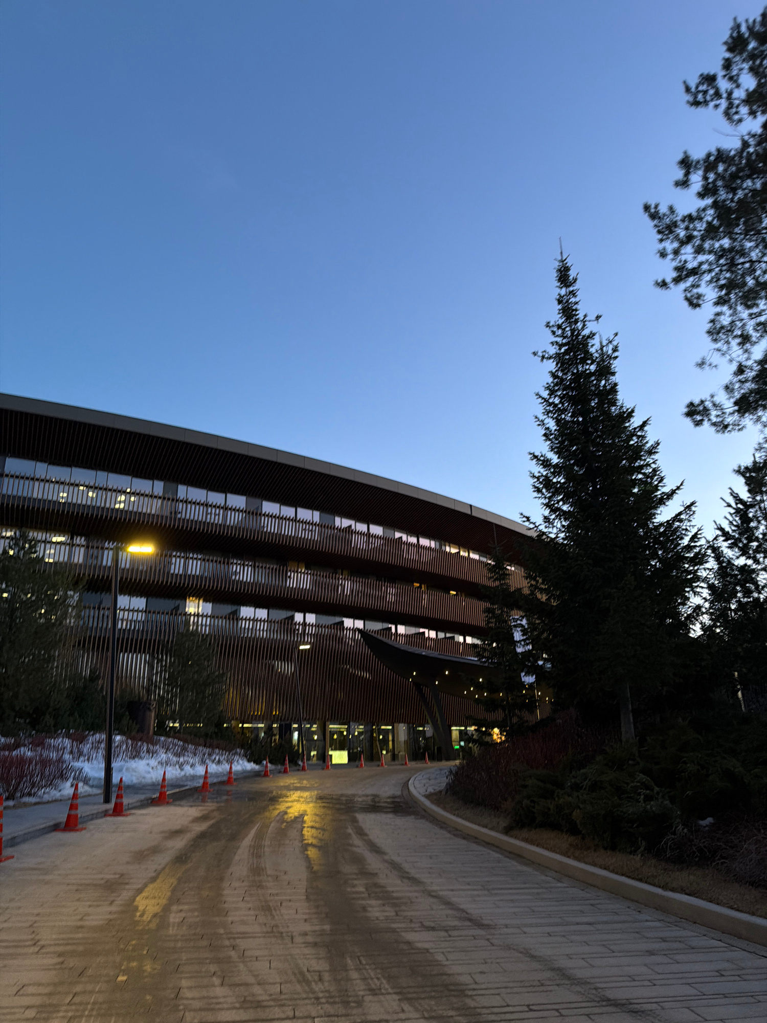 The image shows a curved modern building with horizontal wood-like slats against a blue sky. A tall evergreen tree is partially visible above the building. Along the side of the building is a paved wa…read more